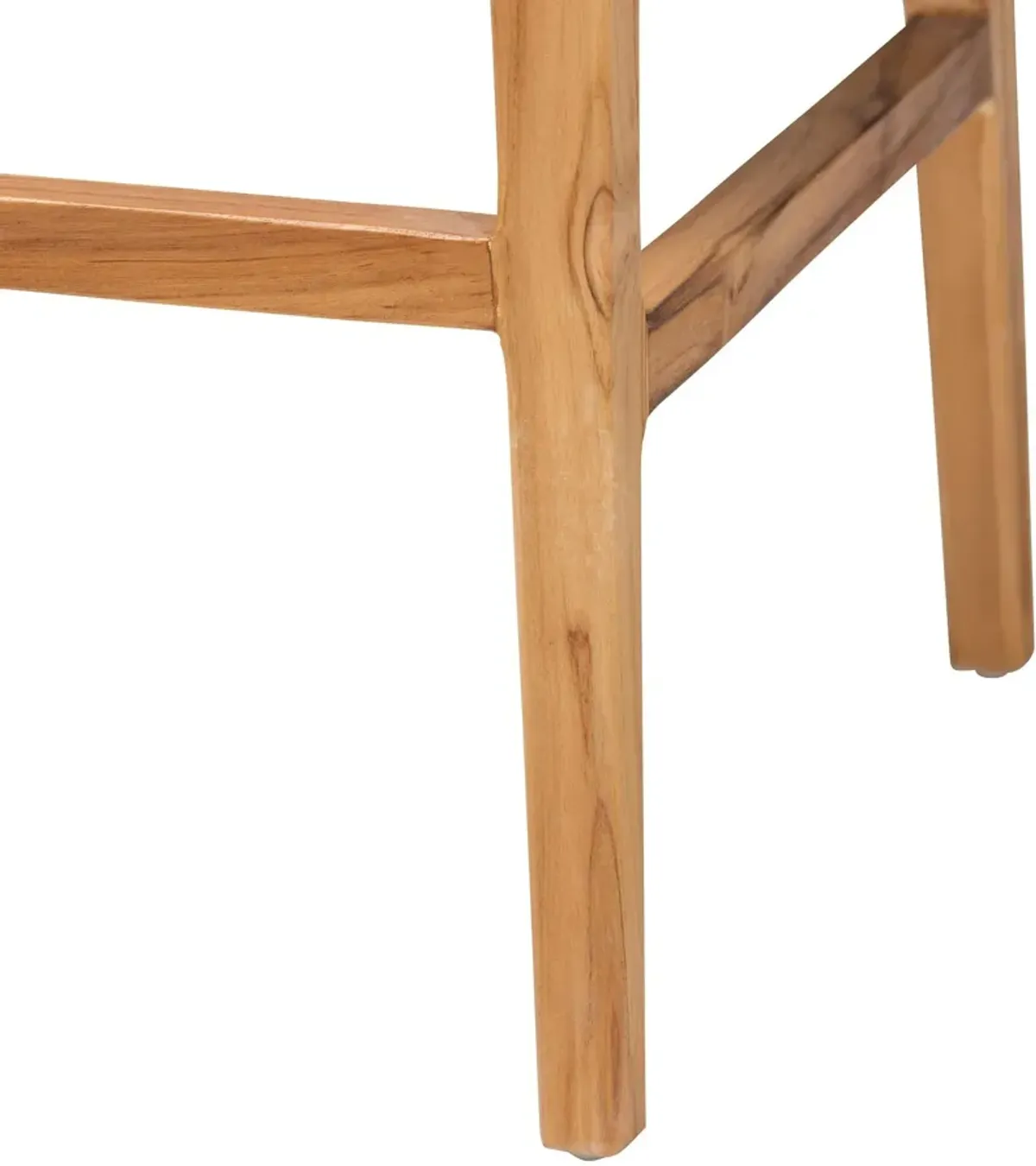 Karimm Coastal Beach Beige Upholstered Natural Teak Wood Frame Outdoor Bar Stool
