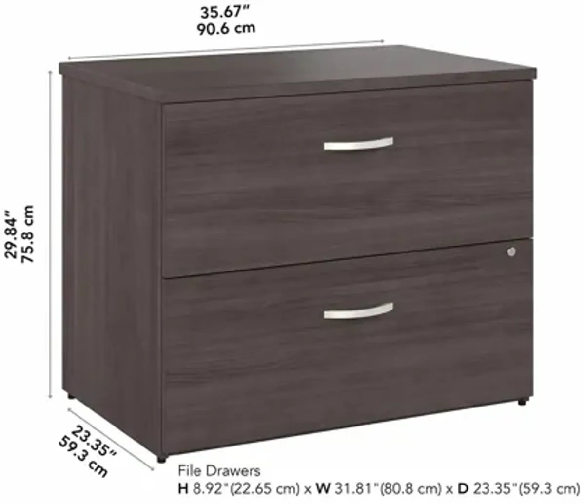 Lateral filing cabinets are short, wide, and low to the ground. Their purpose is to store legal and letter-sized documents that are arranged side-to-side. Typically, these cabinets feature one to three drawers.