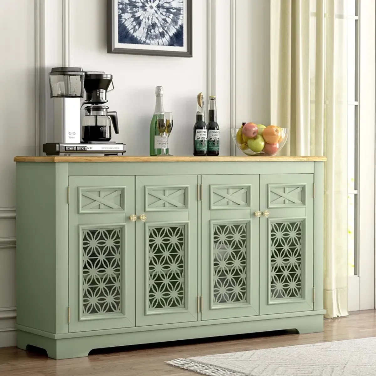 Love classic furniture? Browse for three-door servers in antique green with ornate scrollwork details. If the retro look is more your style, shop for mid-century modern single-drawer tables with an emerald finish and gold hairpin legs. In contemporary rooms, a sage green accent cabinet featuring openwork doors blends in beautifully among neutral furnishings.