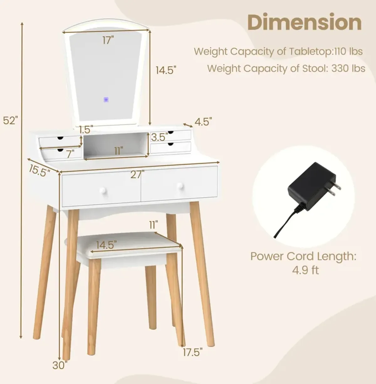 Dressing Desk with 3 Color Lighting and Hair Dryer Stand