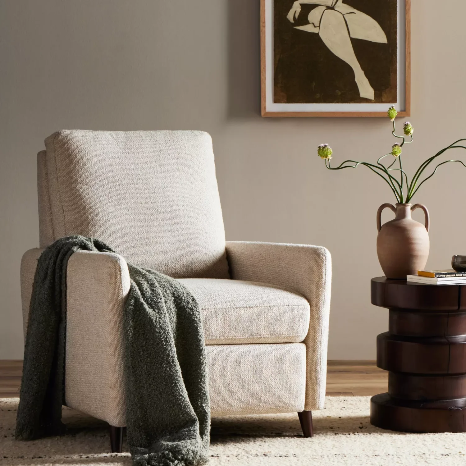 To figure out what kind of recliner is right for you, start by considering your personal aesthetic. If you’re into minimalist design, for example, you might prefer sleek, stylish leather recliners in a neutral color. If you favor rustic farmhouse decor, on the other hand, plush, oversized, comfortable recliners with warm wool upholstery might be more your style.