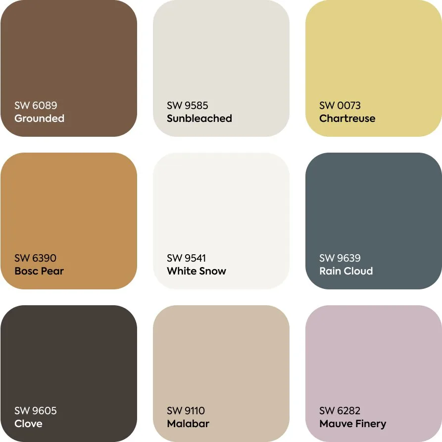 Last but not least, the paint experts at Sherwin-Williams have been choosing a color of the year for 15 years. To honor this anniversary, they’ve chosen nine colors for a full 2025 palette. The complementary choices range from dark brown to stormy blue and lavender — essentially distilling all of the 2025 color trends into one color scheme.