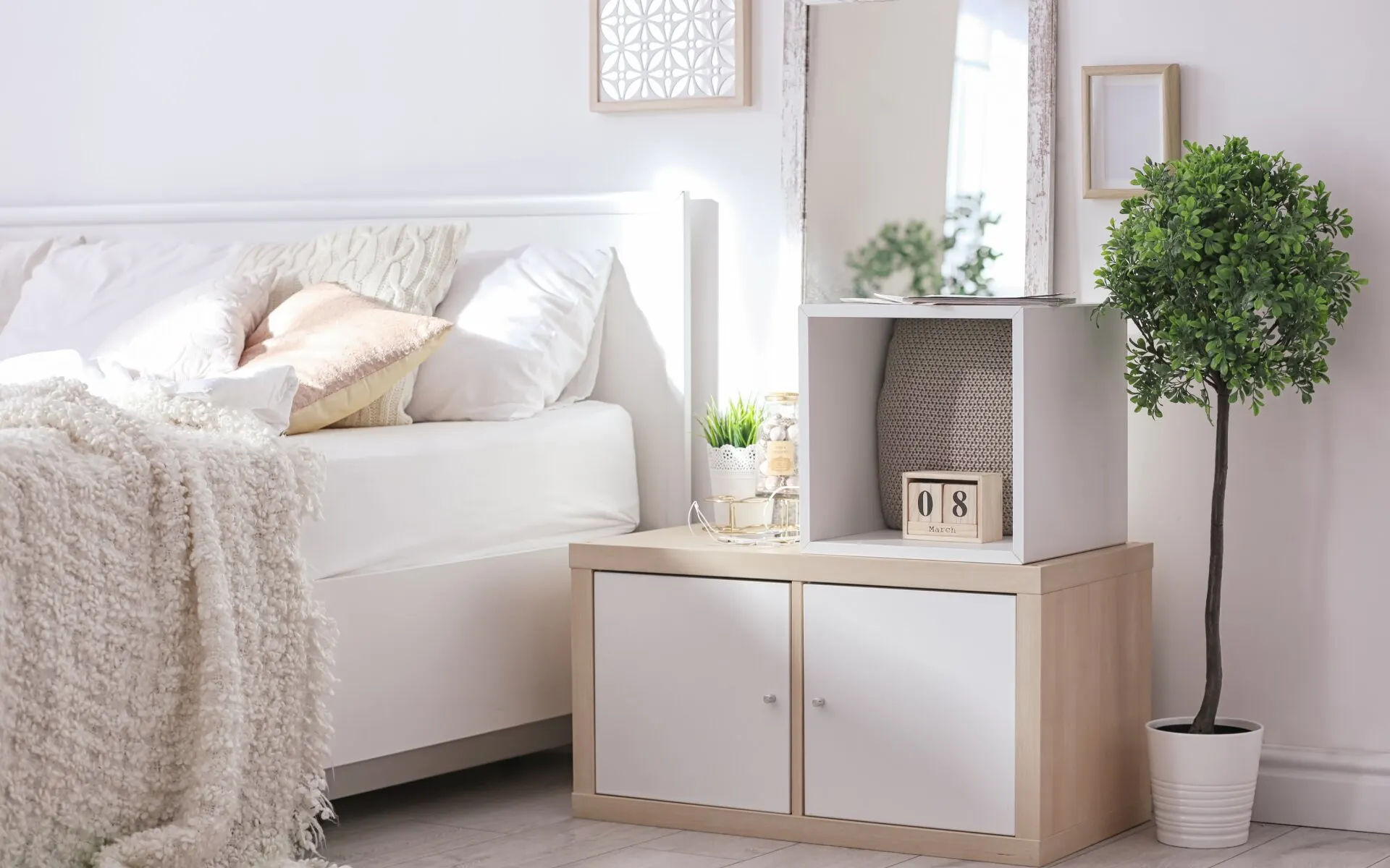 If your bedroom doesn’t have room for a nightstand and dresser, swap them for a chest of drawers. A chest provides ample space and can be positioned next to your bed with the same balancing effect as a nightstand.