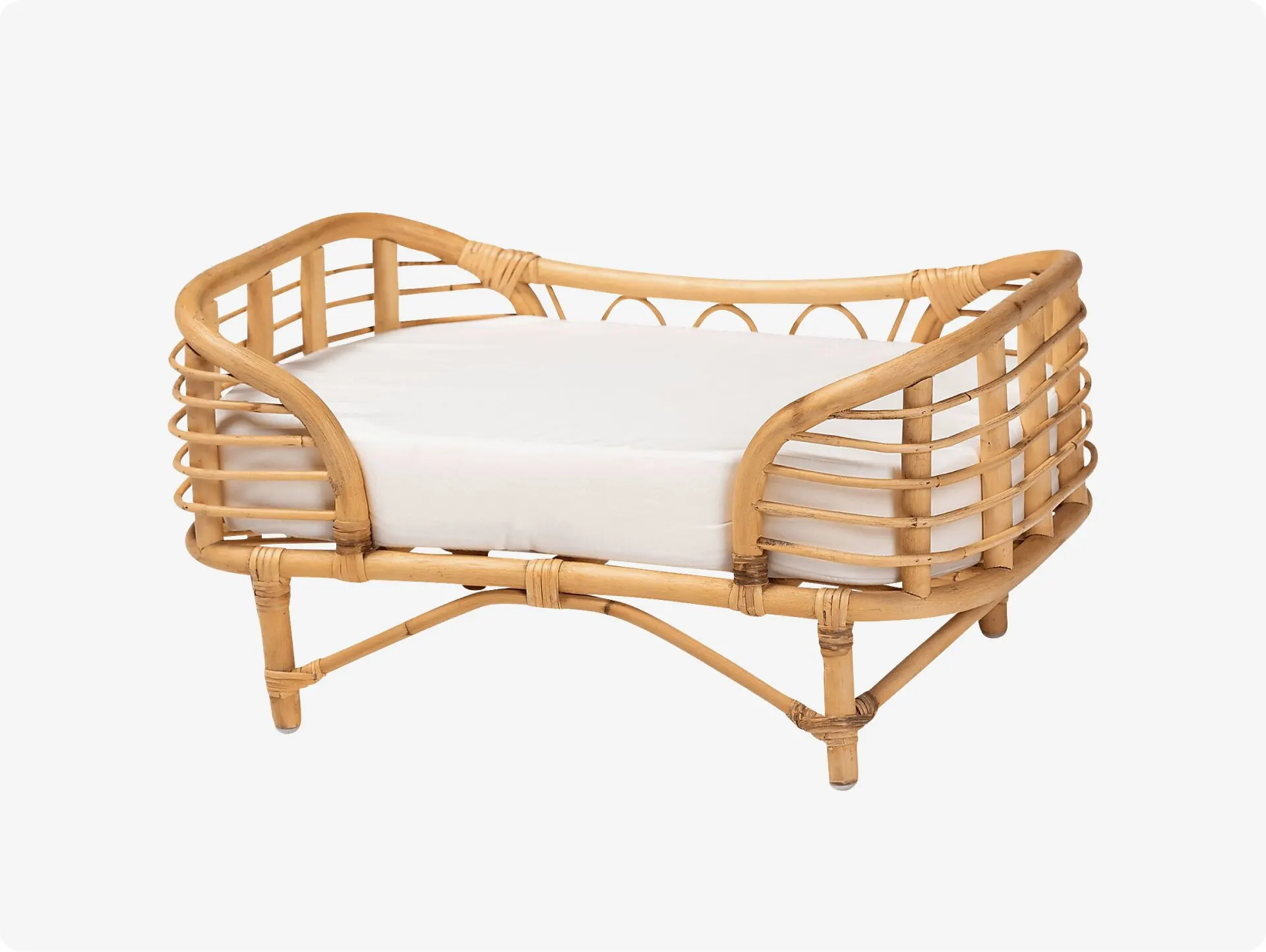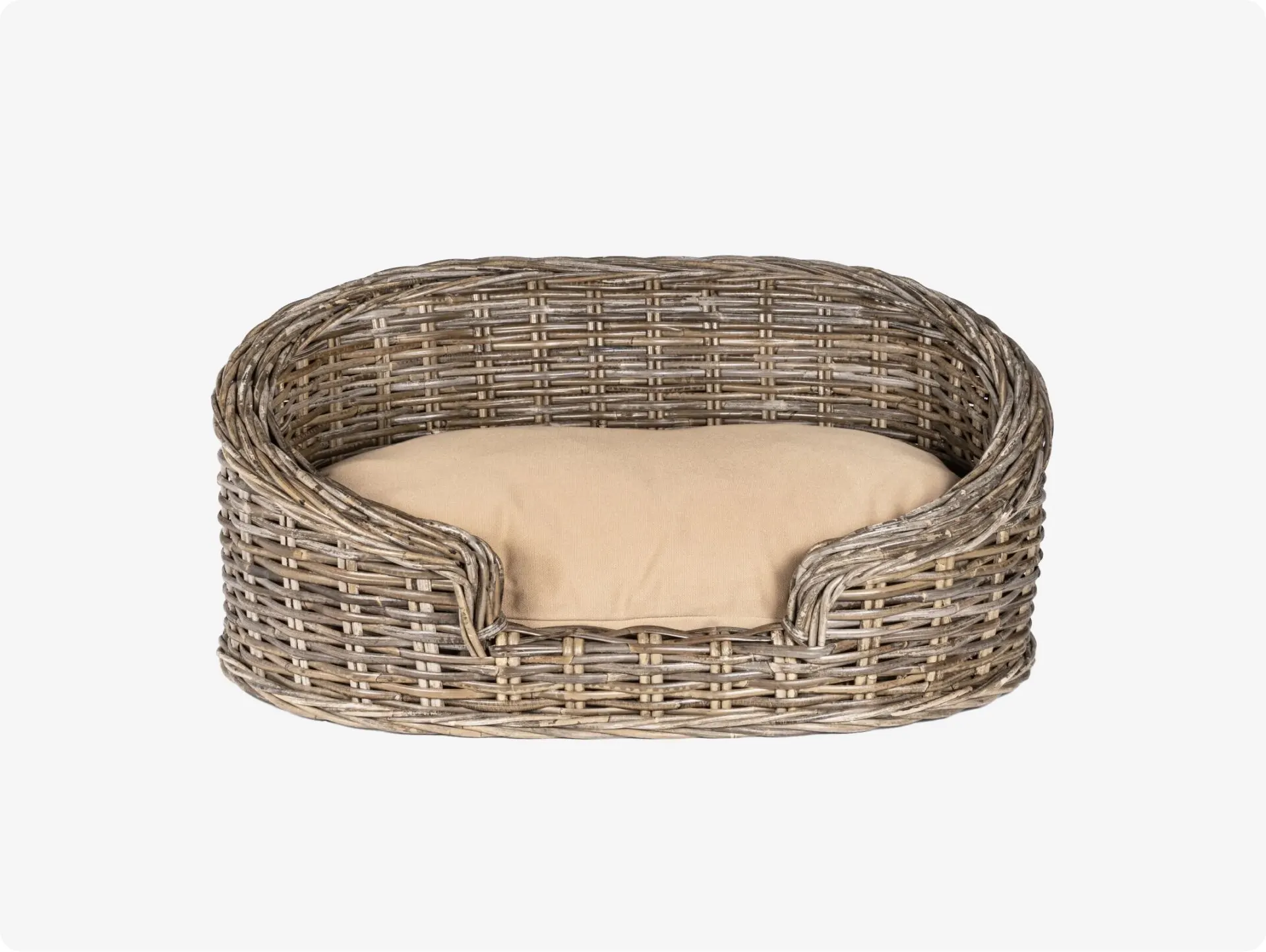 Complete your farmhouse or cottagecore interior style with a rattan dog bed that looks like it could be a vintage gem. Handwoven into an elegantly curved basket-like shape, the small bed offers coziness, comfort, and easy maintenance with a cushion that can be machine-washed for practical ease.