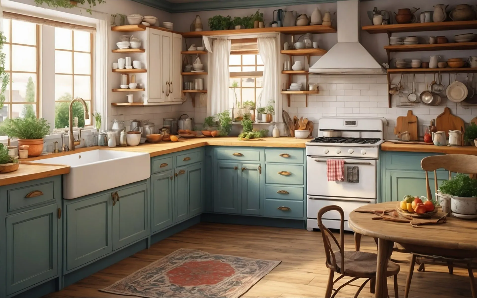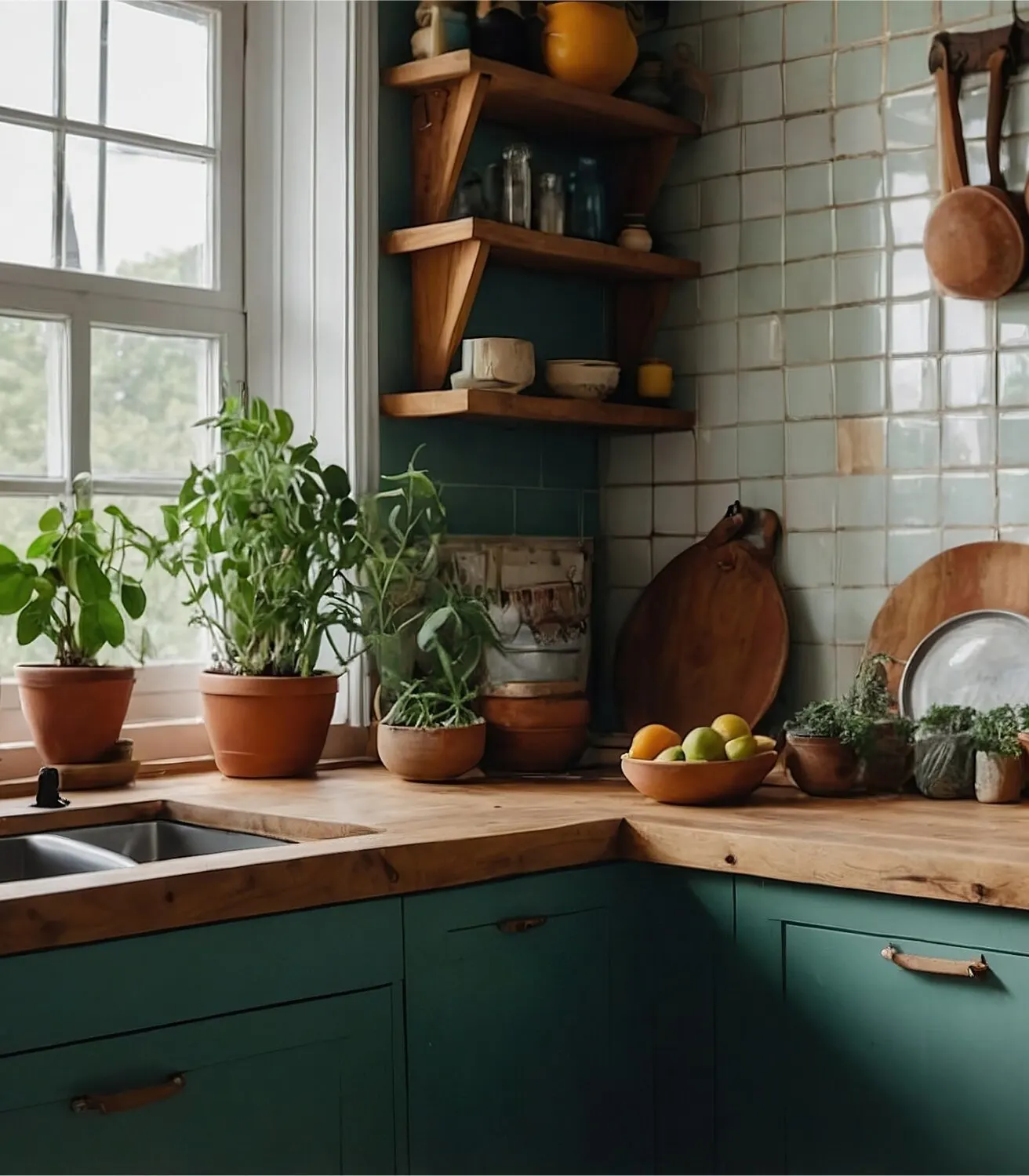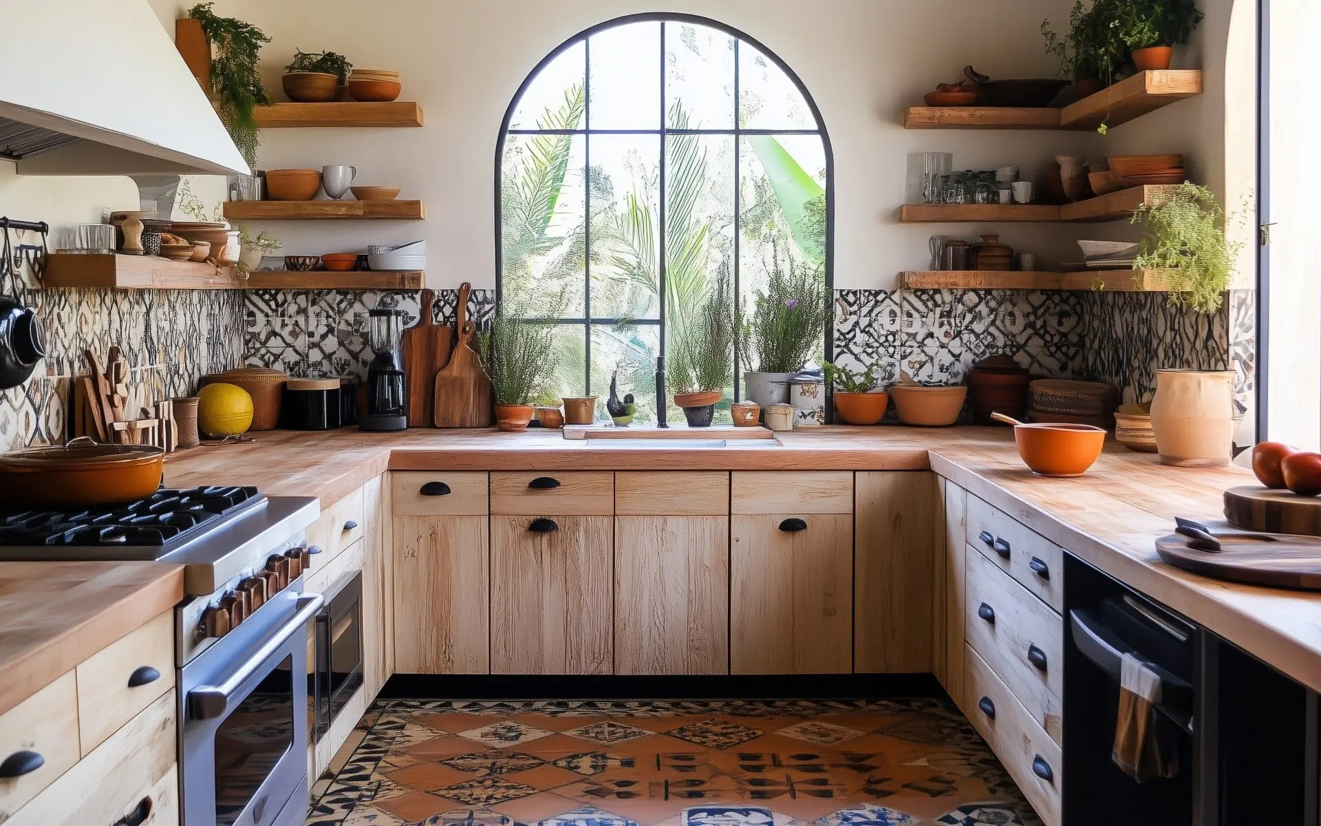 Now it’s time to layer on some visual interest through a palette of rich and earthy hues, vibrant accent colors, and nature-inspired patterns. Some popular boho kitchen colors include terracotta, oceanic blue, warm gold, and lush green. You can add these pops through painted kitchen cabinets, eye-catching dishware and colorful glassware, and different wallpaper or patterned tiles on your backsplash that create a medley of color and texture. For patterns, there are a lot of options to consider for nature-inspired motifs, from flowers and tropical leaves to tigers, forests, and other natural scenery.