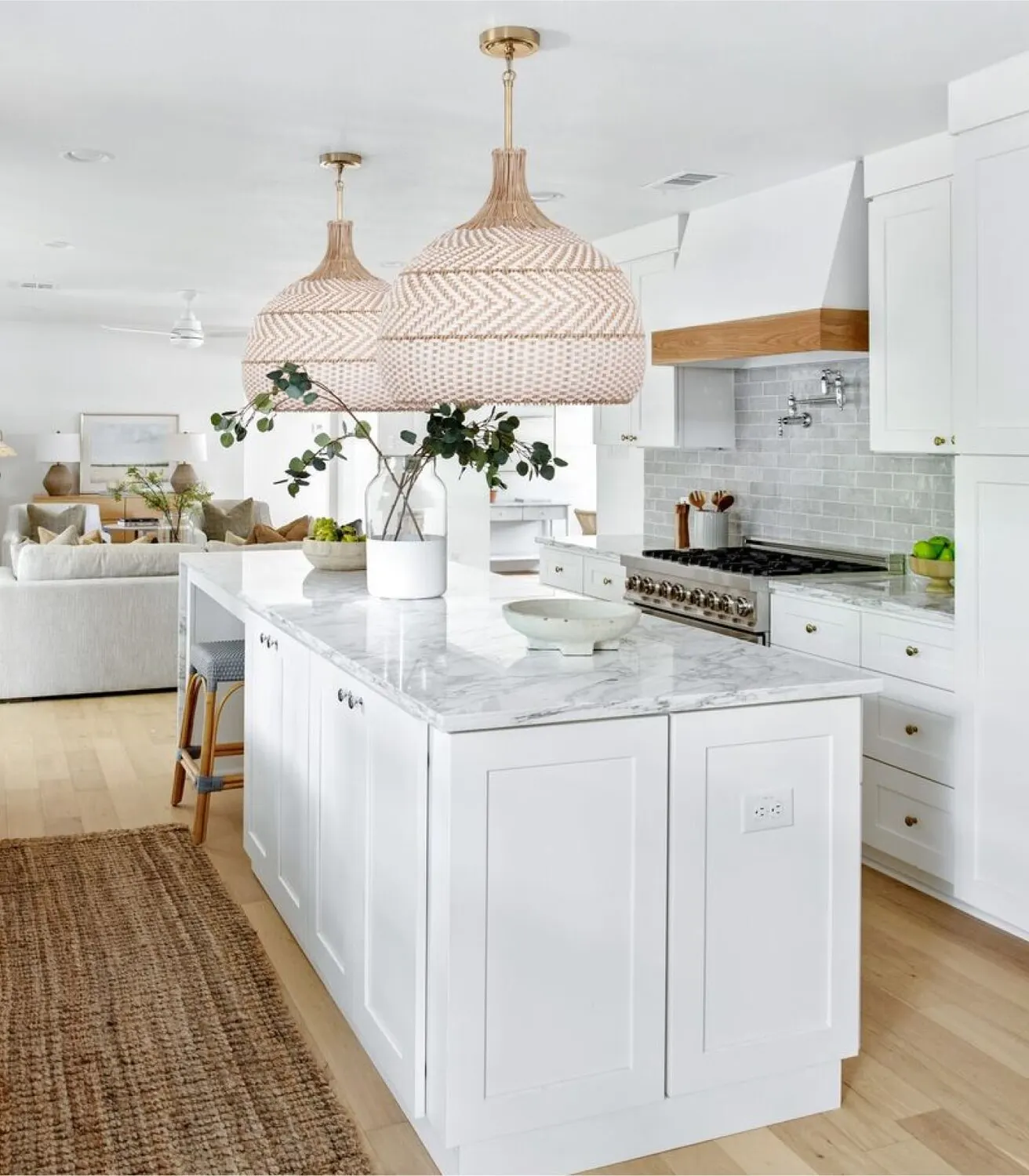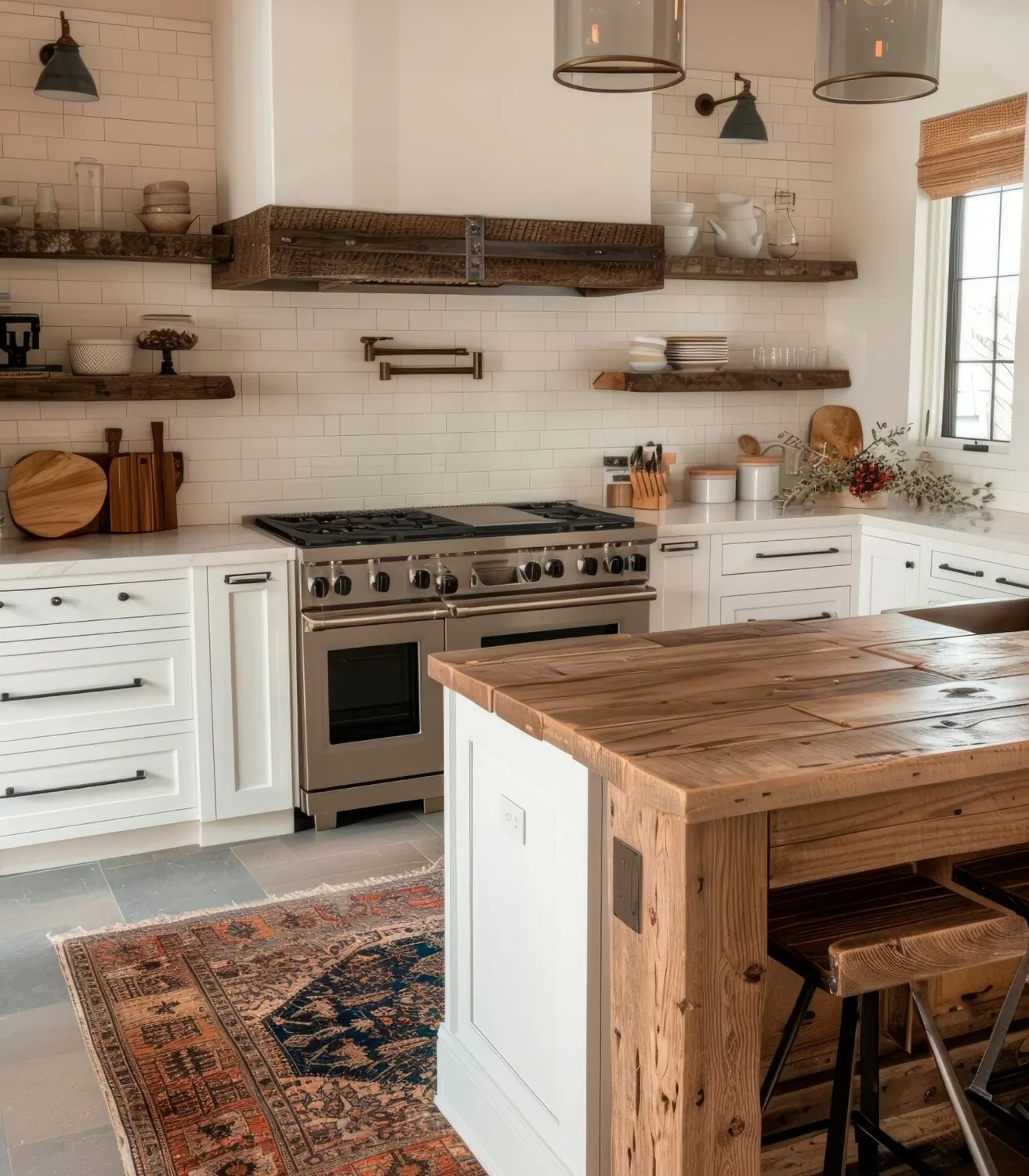 Although boho style is often coveted for its vibrant use of color and patterns, set the foundation first and foremost with natural materials. We love organic-feeling elements that call to mind mainstay features of modern farmhouse style, from a nostalgic farmhouse sink to classic wooden butcher block countertops. You can enhance this sense of natural beauty and charm by adding floating shelves made of distressed wood or even woven baskets that provide a breathable vessel to keep fruits and root vegetables fresh.