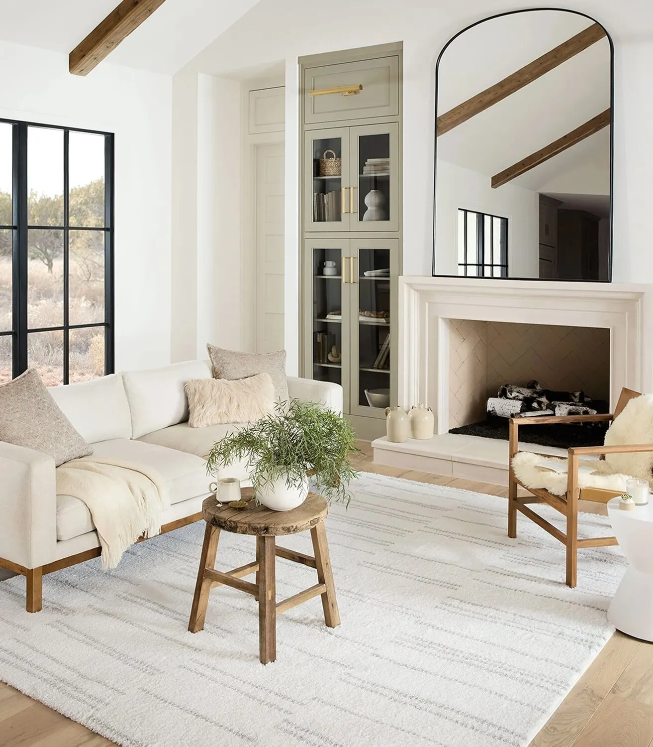 Start with a neutral sectional or oversized couch. Add some woven rugs for a natural element. Incorporate some statement lighting to provide plenty of illumination. Finally, add some comfort elements — think soft throw blankets or plush pillows — that create visual interest while also functioning to provide comfort as you sit around together.