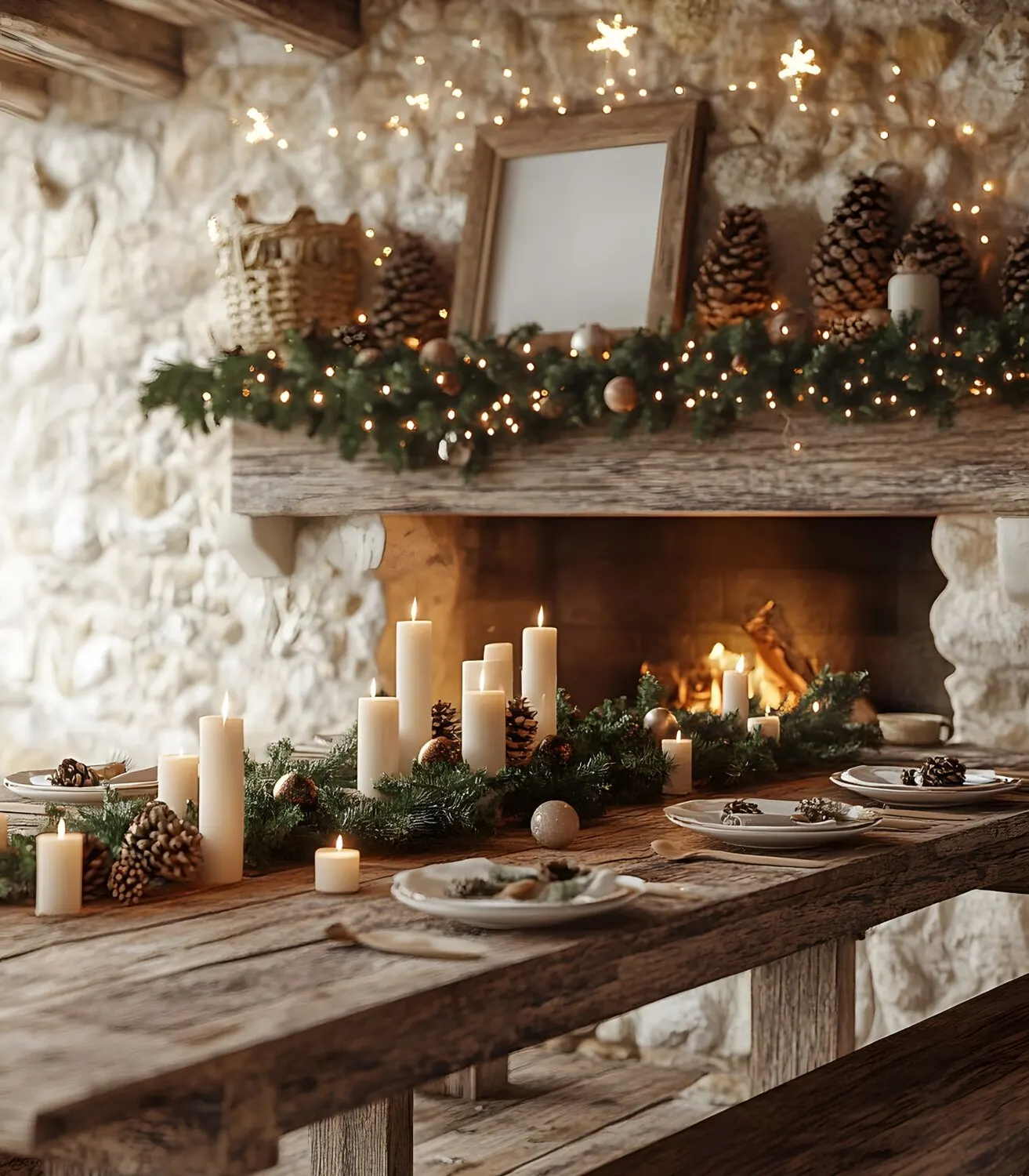 The easiest way to create a cozy ambiance is by using low and warm lighting. Fairy lights, also known as Christmas lights, are a great festive option to deliver an enchanting and magical glow. You can string them throughout your cottagecore Christmas tree, wreaths, garlands, and even around your mantel and windows. For a delightful piece of tabletop decor, simply fill a mason jar with twinkling fairy lights. We also recommend using a mix of pillar candles, tea lights, and lanterns for a dose of classic, old-timey charm.