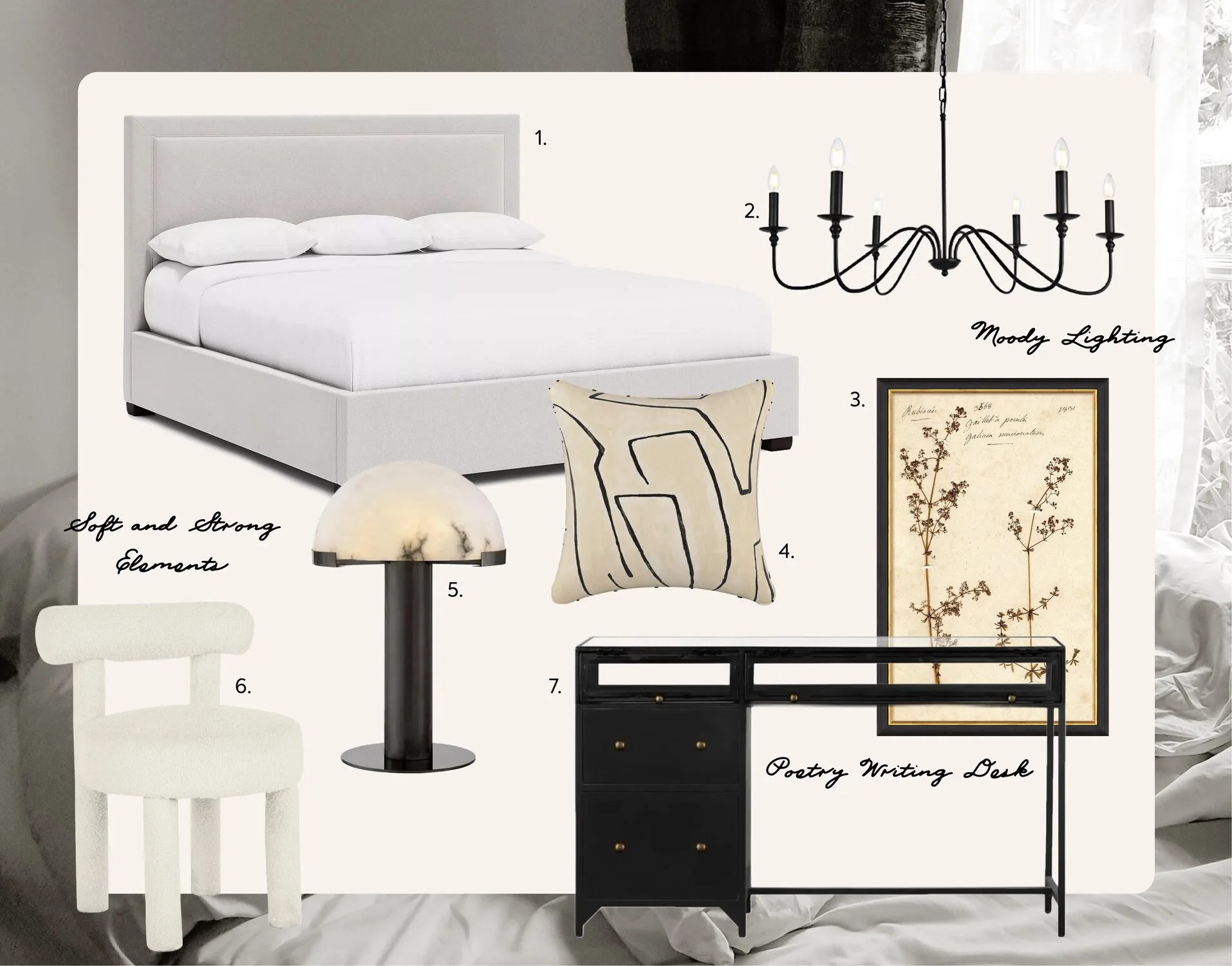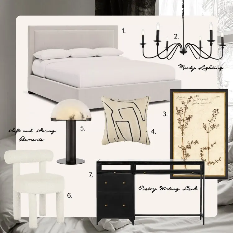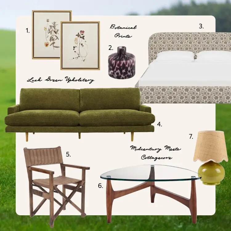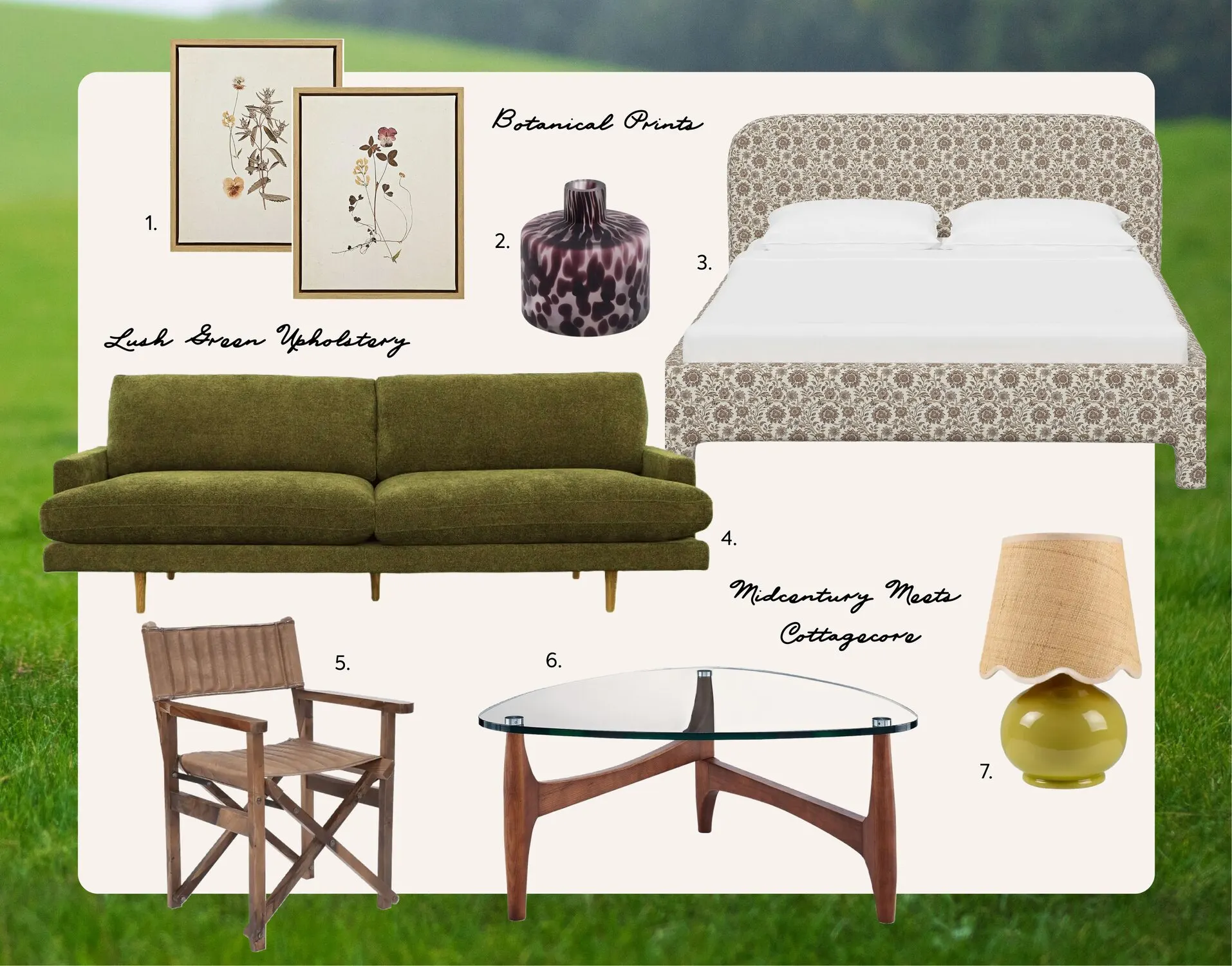 1. Rooms To Go Muscatel Multi Framed Canvas | 2. Bloomingdale's TOV Furniture Pickle Glass Vase | 3. Lulu and Georgia Kaisley Platform Bed | 4. Raymour & Flanigan Inverness Sofa in Dark Olive Green by Bellanest | 5. Rooms To Go Huguenot Brown Accent Chair | 6. Lamps Plus Ledell Walnut Ash Wood Coffee Table | 7. Bloomingdale's Surya Stella Diminuta Table Lamp