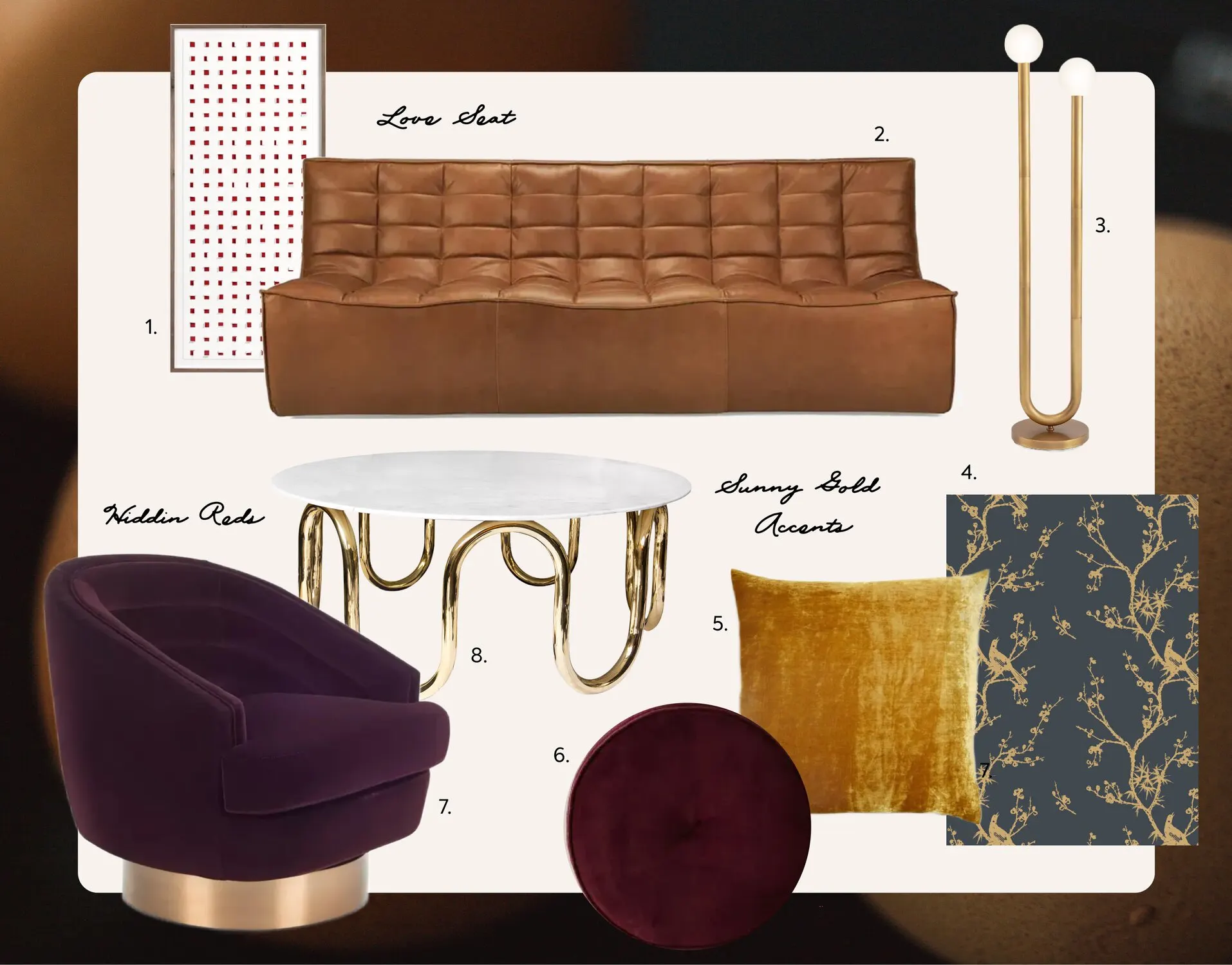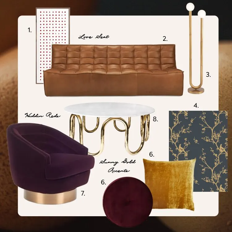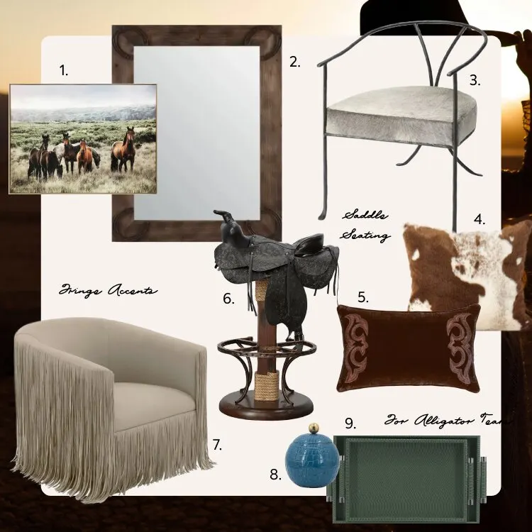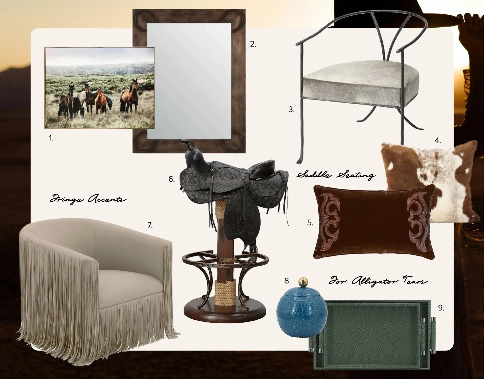 1. Lamps Plus Crestview Collection Wyatt Canvas Print | 2. Lamps Plus Crestview Collection Abbott Wooden Wall Mirror | 3. Bloomingdale's Jamie Young Kai Chair | 4. Steinhafels Brown Cow Hide Faux Fur Poly Pillow | 5. Raymour & Flanigan Trendsetter Lumbar Pillow in Copper Brown | 6. Rooms To Go Rulen Brown Swivel Barstool | 7. Bloomingdale's TOV Furniture Shag Me Faux Leather Swivel Chair | 8. Rooms To Go Birkenfeld II Blue Pot | 9. Rooms To Go Greenwell Green Tray