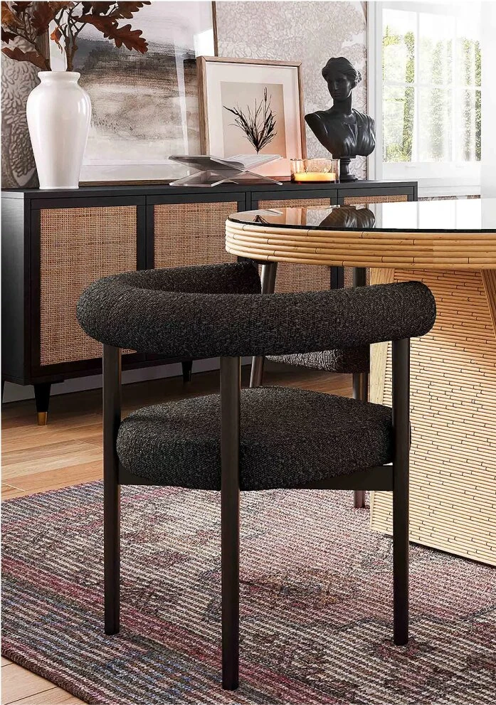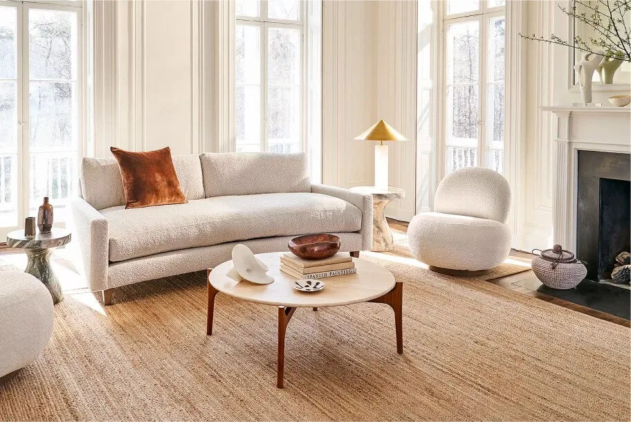 Ever noticed a fuzzy and bumpy fabric on curvy sofas, accent chairs, and ottomans? That’s boucle, a super-trendy wool fabric crafted with tiny loops and curls that give it its signature nubs. Despite its tactile look, boucle is soft and fleecy to the touch, making it the go-to option for reading chairs and sectionals that invite you to snuggle in. If you’re looking to add a dose of hygge coziness to Scandinavian and modern styles, choose boucle furniture in dove gray or cream white that really highlight its wooly, fall texture.