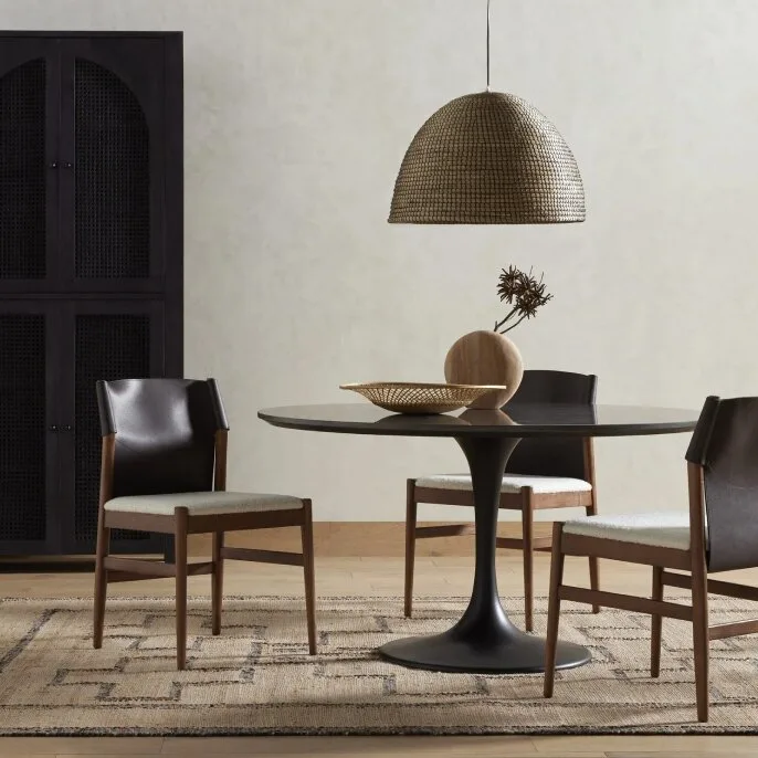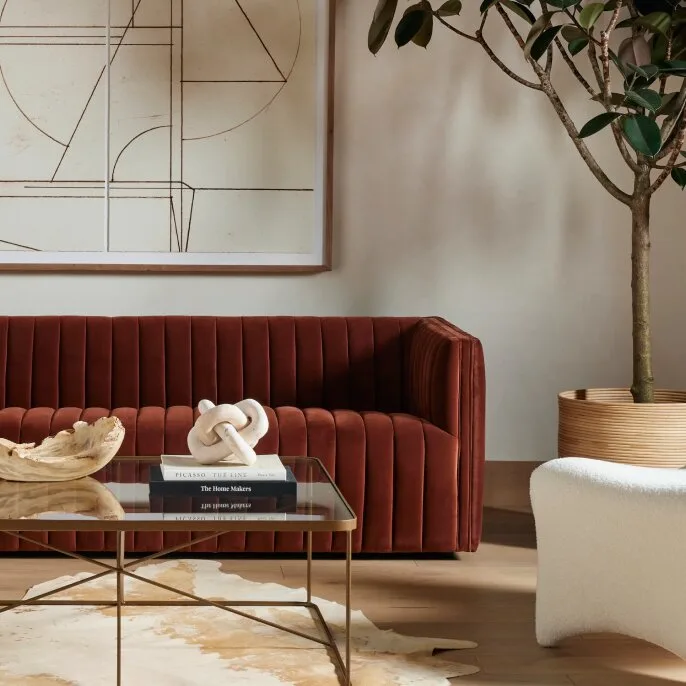 A staple in glam style, velvet is the ultimate touch of elegance and sophistication for any room. The dense pile, made of a blend of silk, cotton, wool, or synthetic fibers is buttery soft to the touch and beloved for its ability to be retain rich colors. The high-end upholstery is often found on couches, chaises, settees, and headboards — often paired with touches of brass and gold that glitter brighter against the sumptuous backdrop. Worried velvet is too high maintenance for your home? Choose performance velvet for extra durability while still incorporating fall texture.