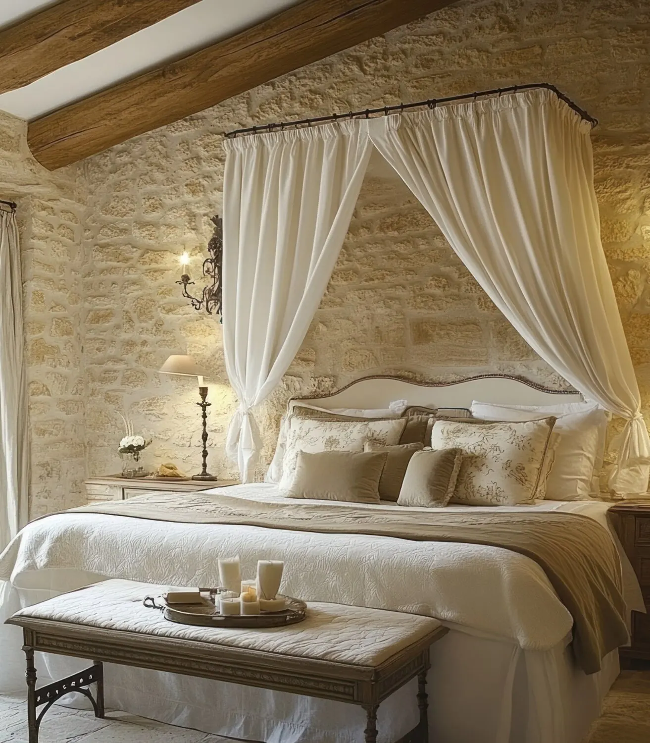 In a French country style bedroom, you’ll likely want to lean into the cozier rustic and farmhouse elements of the aesthetic, while using the modern style pieces as a bold accent. You may want bed linens in soft, natural fabrics such as cotton or wool. Undyed fabrics or neutral colors such as beige and brown can lean even more into that rustic feel.