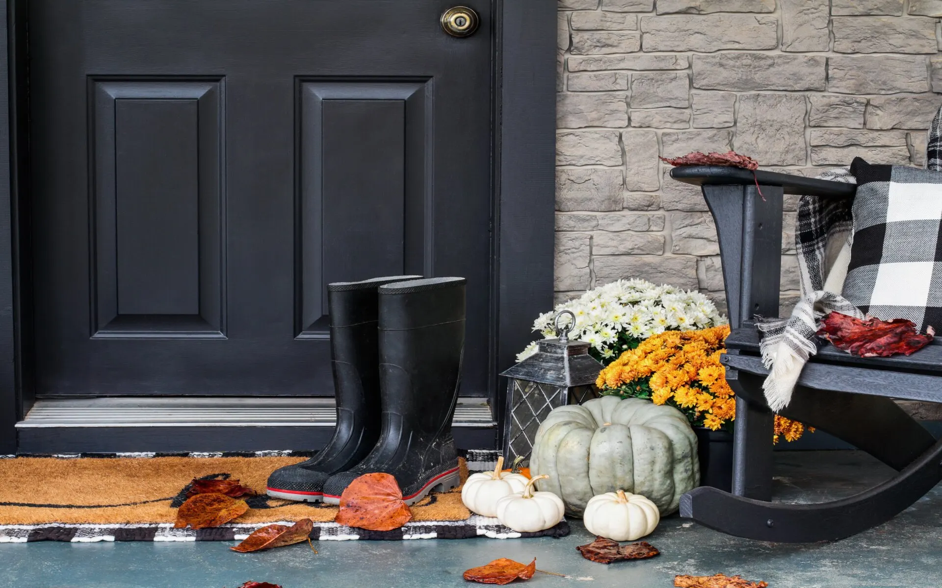 In the springtime, nature blooms — and your front door should reflect that! Embrace bright colors, nature-themed decor, and soft lighting. Decorations such as floral wreaths, potted plants and flowers, colorful doormats, and butterfly- or bird-themed details can really help put together that start-of-spring feel. If you have a bit of extra space on your porch, an outdoor accent chair can also work wonders.
