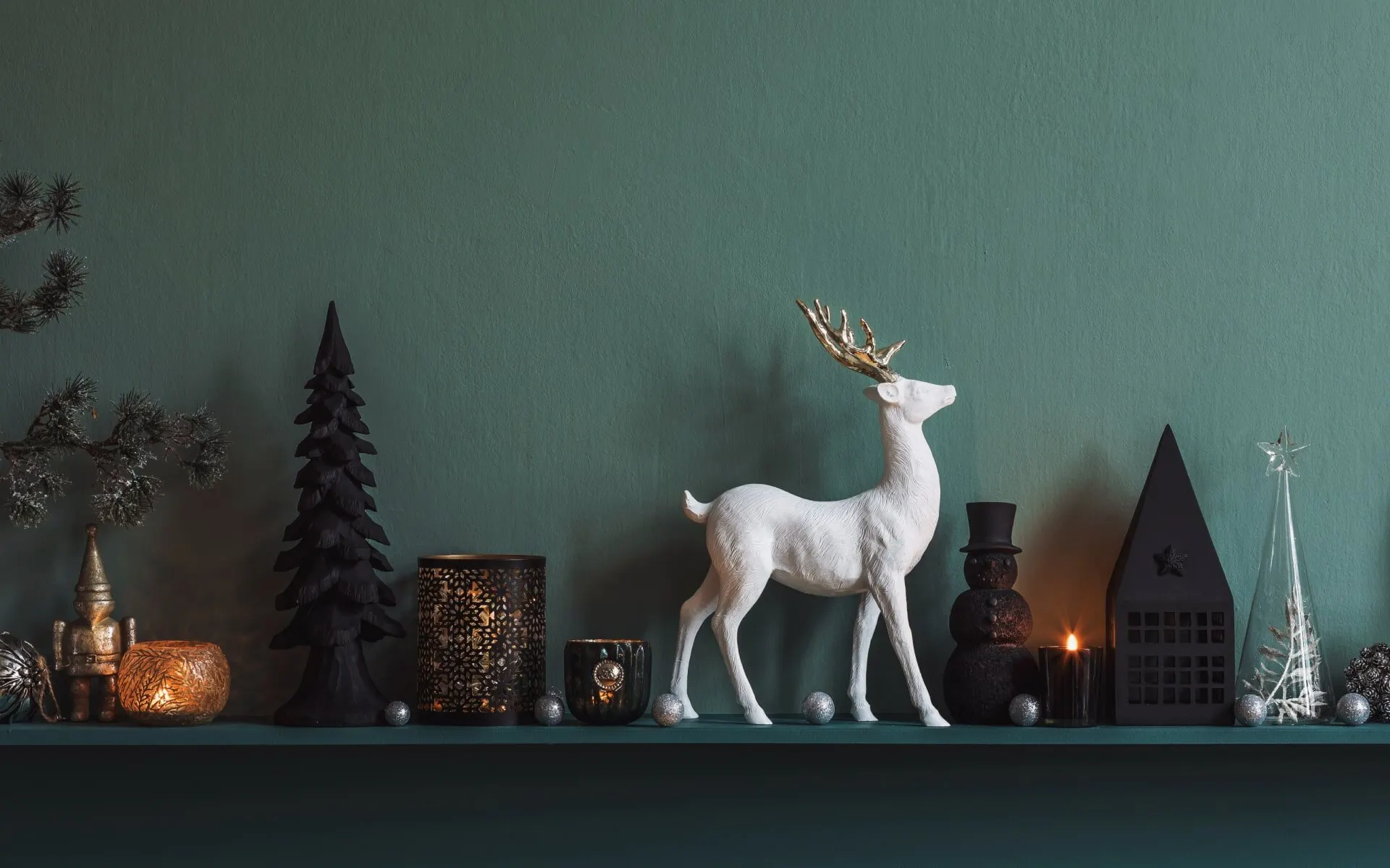 Warm and softly layered light is in year-round — so let’s add some twinkling Christmas lights. You can string fairy lights throughout your space, from doorways to the mantel to the Christmas tree. We also recommend adding candles, glittering metal candlesticks, and mirrors that can further enhance all this extra sparkle.