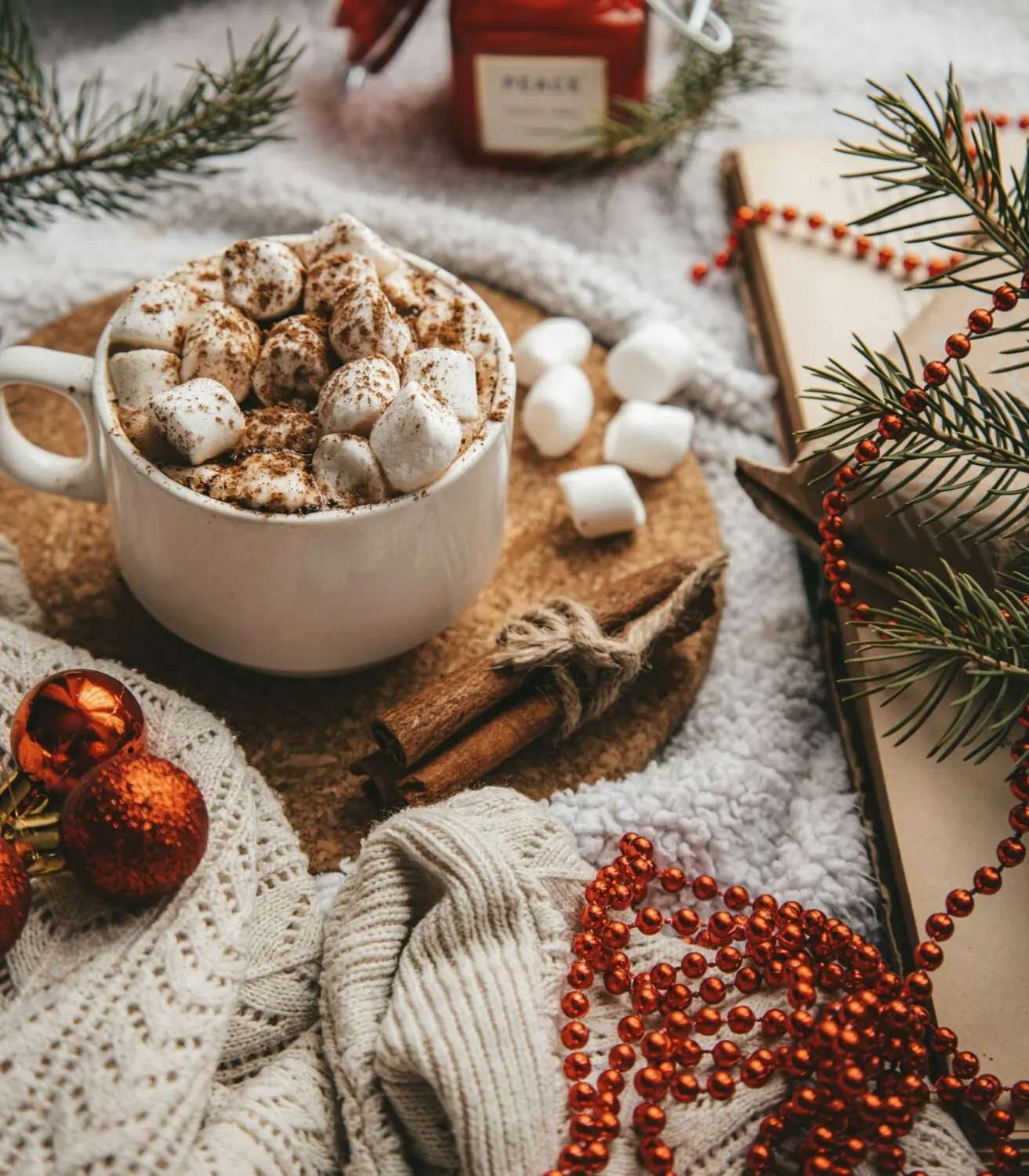 More of a feeling than a look, it’s essential to create a warm and inviting environment in the lounging area. Make sure you layer in throw blankets and decorative pillows for sensory delight. To add more fleecy softness, cozy warmth, and covetable texture, consider adding in more touchable details like chunky knit stockings and velvet bows.
