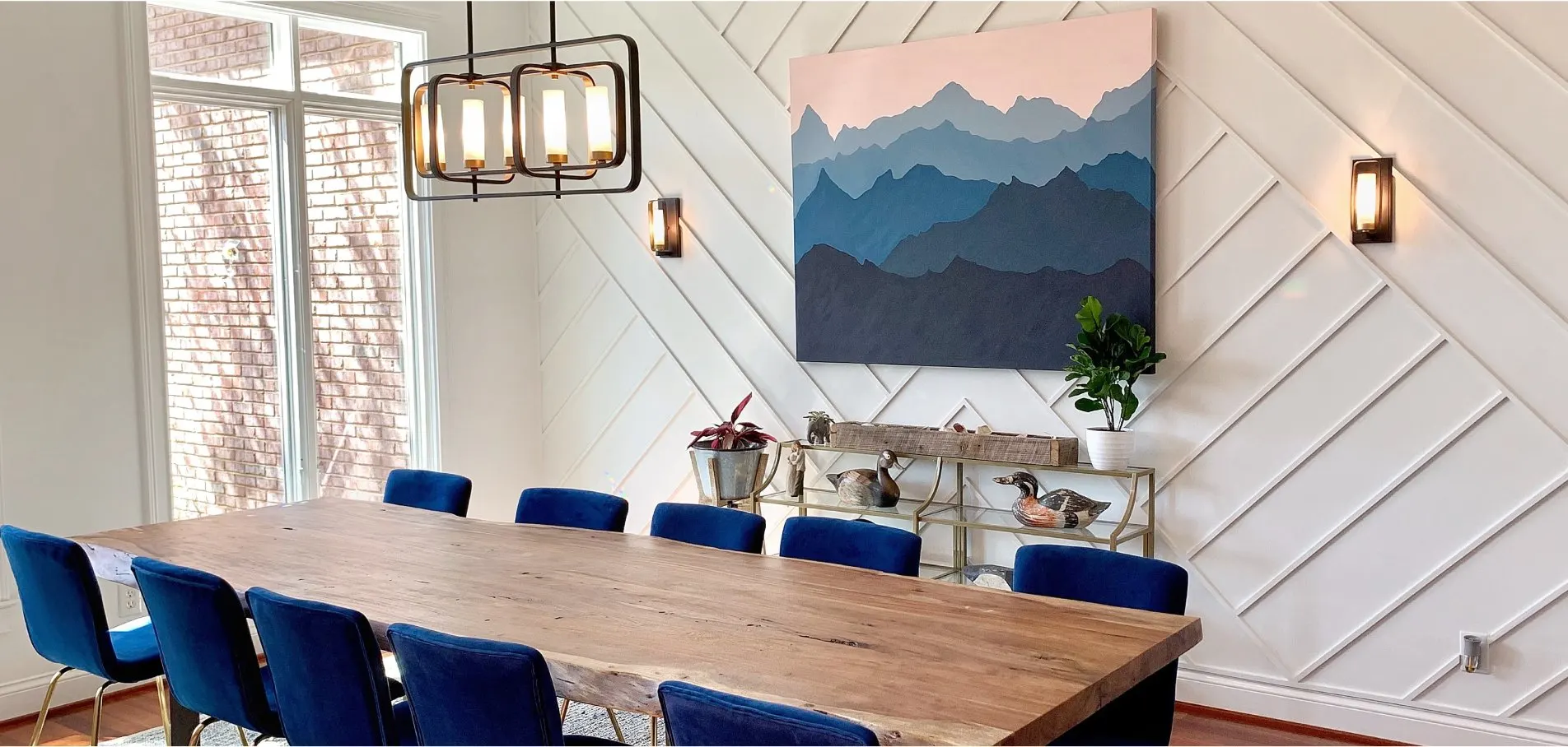 Focal points in the dining room include an elegant and eye-catching light fixture as well as a statement piece of furniture, like a dining table or sideboard. Complement your focal point with accessories and decor, like a large painting, rug, or centerpiece for the table.