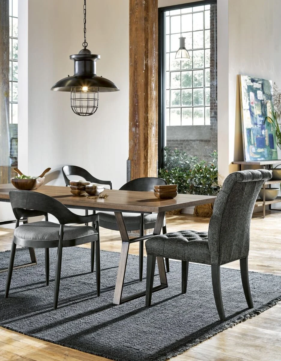 Measure your dining table and choose a rug at least 4’ longer and wider. This size will fit neatly under the table and all the chairs to catch crumbs and spills.
