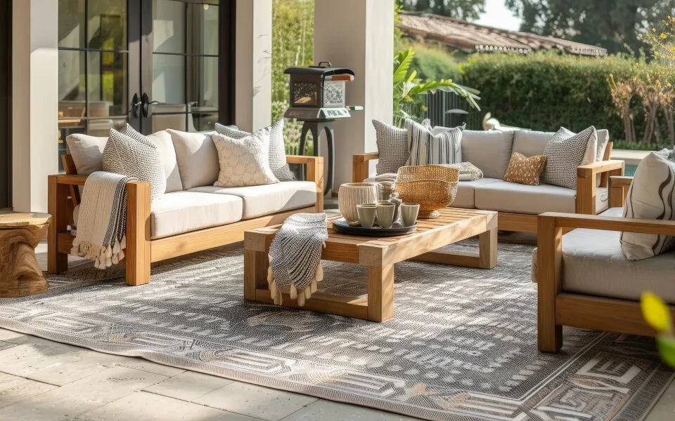 The best outdoor rugs are UV- and water-resistant. They’re typically made from durable synthetic materials like acrylic, nylon, and polypropylene.