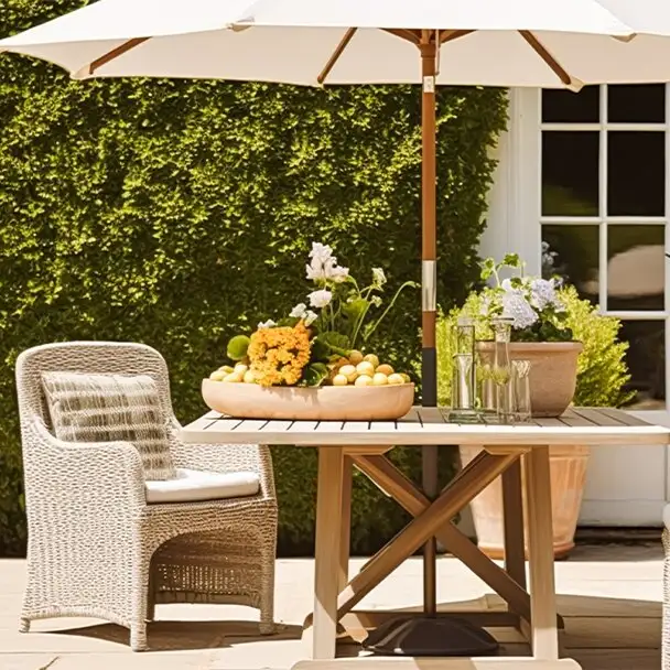 Keep things fresh yet classic with hues from white to light gray to tan for your patio furniture and outdoor rugs. Use materials that keep to the theme: wicker seating, teak coffee table, concrete pots for greenery, and neutral cushions and blankets.