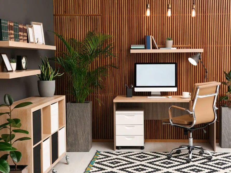 Set up a compact desk near a window to take advantage of natural light. You’ll want a comfortable chair that can be moved easily between the desk and other areas. A wall-mounted shelf above the desk can hold books and office supplies.