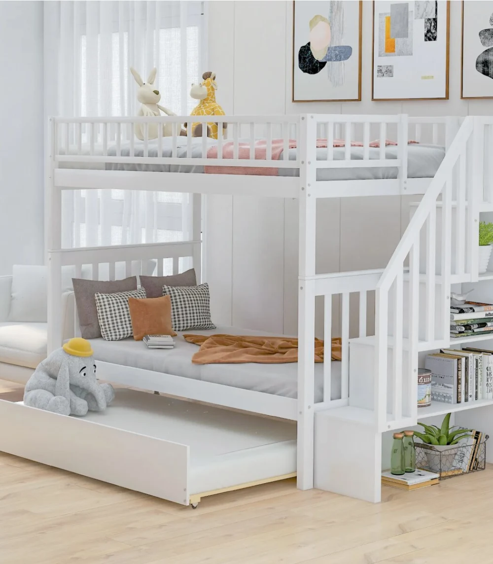 When furnishing small spaces, don’t forget to look up. There’s so much wasted vertical space in most rooms — especially rooms with high ceilings. Draw the eye up with taller bar-height tables and stools in your dining or kitchen areas. In the bedroom, especially for the little ones, opt for lofted beds or bunk beds that can save you a ton of floorspace. For storage, consider skinny and tall bookcases, dressers, or floating shelves that can declutter your space without taking up a lot of room.