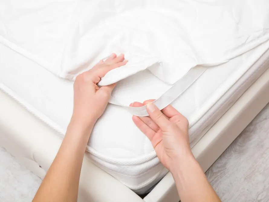 Align the topper or pad with the four corners of your mattress. If your pad has a stretch skirt, pull it over the edges, ensuring all sides are tucked in.