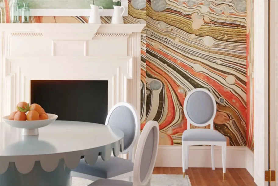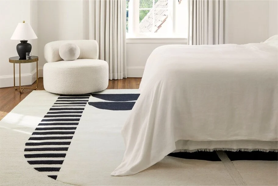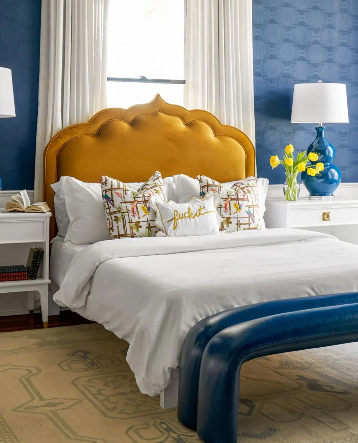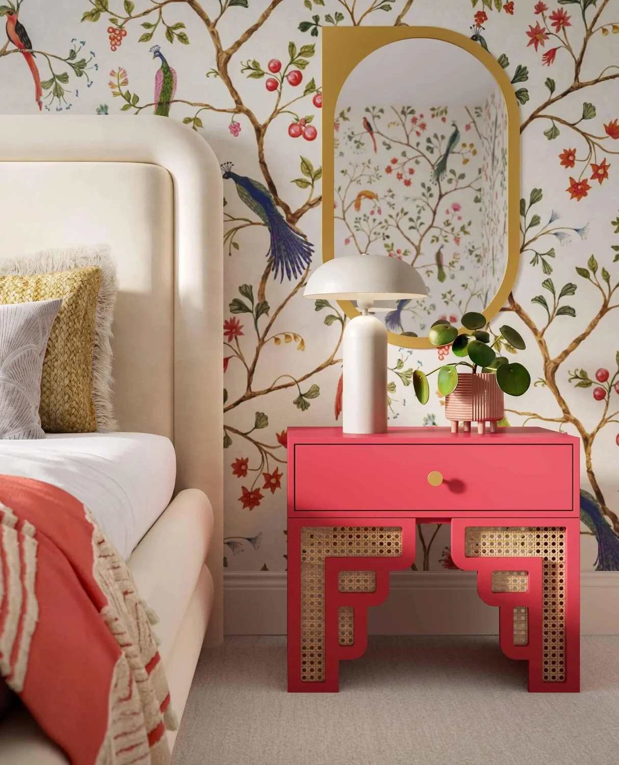 A bedroom is a space for serenity, so it’s important that we avoid creating an overwhelming look. Keep things grounded with classic bed frames and dressers, though you can add a bit of interest by mismatching the nightstand from the rest of your setup. Then, start layering in lots of dynamic elements — but in a cozy and homey way. Create a plush bedscape piled high with linens and decorative pillows that incorporate fun texture, pattern, and color. For even more depth and warmth, dress your walls with drapes, funky wallpaper, and mirrors with interesting frames that hew to your personal taste, from ornate vintage mirrors to modern wavy mirrors.