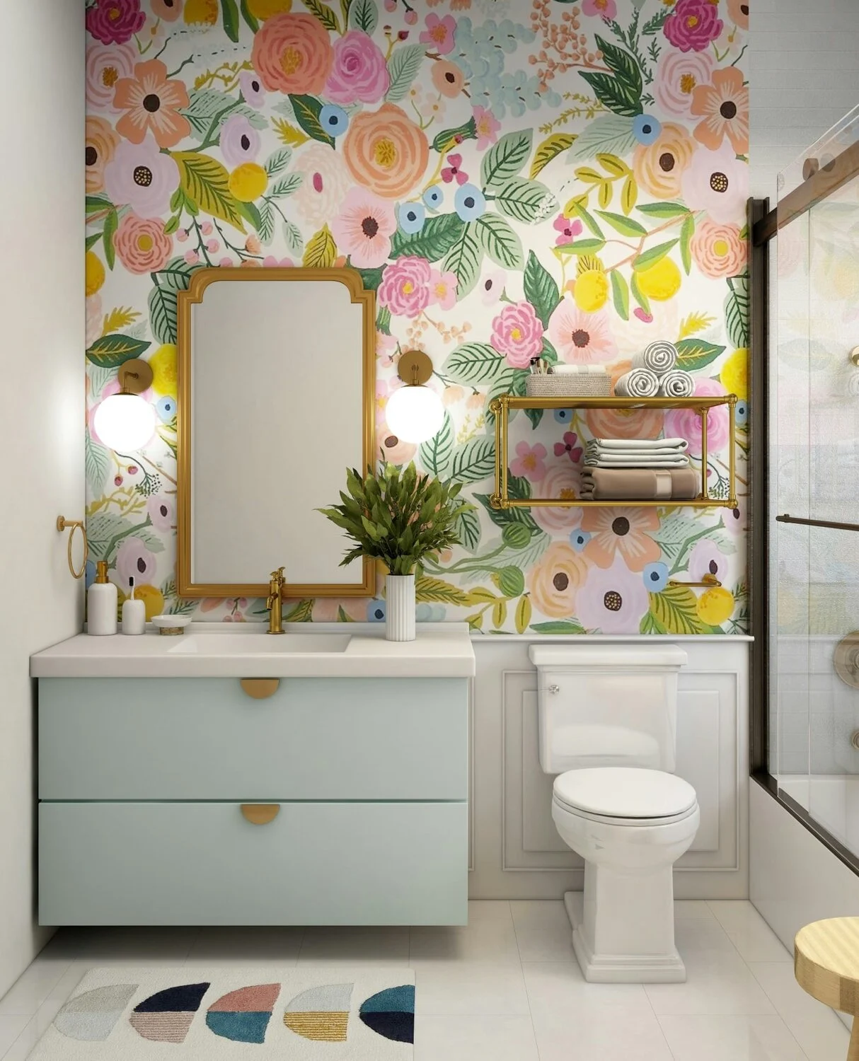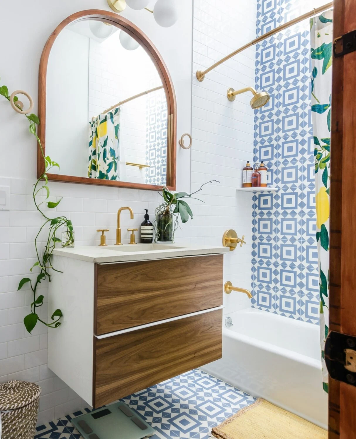 The bathroom is usually a fairly small and sterile room. But it’s easy to turn it into a bright, tropical paradise. Try using bold and colorful patterned tiles or vanities with an eye-catching architectural flair to make your bathroom feel unique and indulgent. For smaller touches, consider upgrading your lighting fixtures with a whimsical sparkle of gold or brass. Or upgrade your minimalist towels, bathmat, shower curtains, and even the soap dish for something with more character. Think wild prints and bold colors that showcase your personality. Finally, consider adding a touch of biophilic charm with humidity-loving plants (or artificial plants).