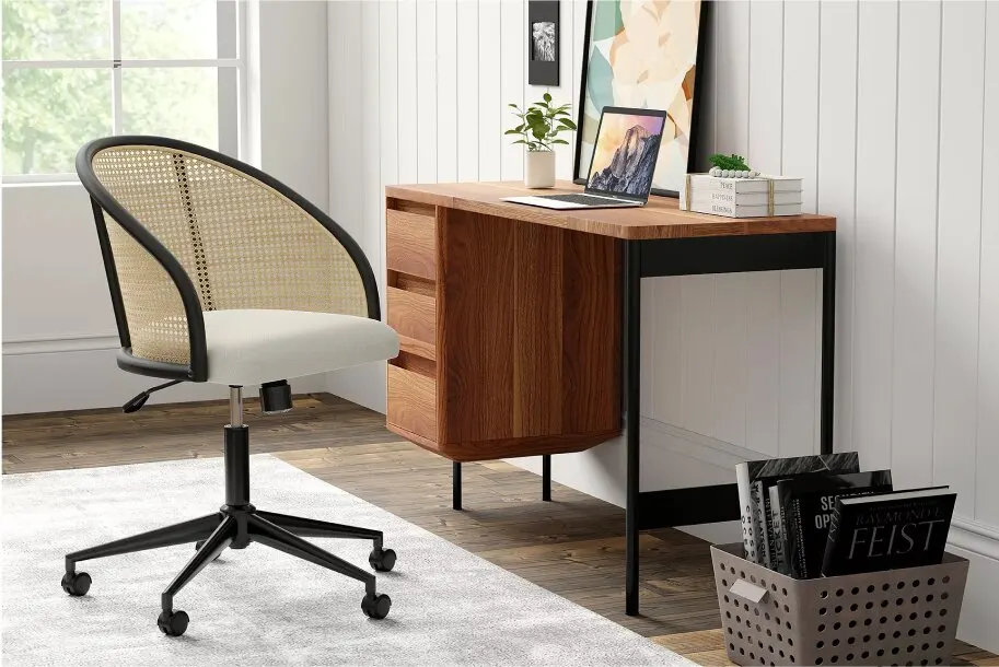 If you decide to forgo an ergonomic office chair for a more standard side chair, you can get an elegant upholstery option like cozy boucle, or classic leather. But don’t forget to factor in breathability when you’re shopping for various upholstery options. If you tend to overheat when sitting in one seat for a while, consider more open and woven materials that allow for better airflow like woven rattan or a mesh performance fabric.
