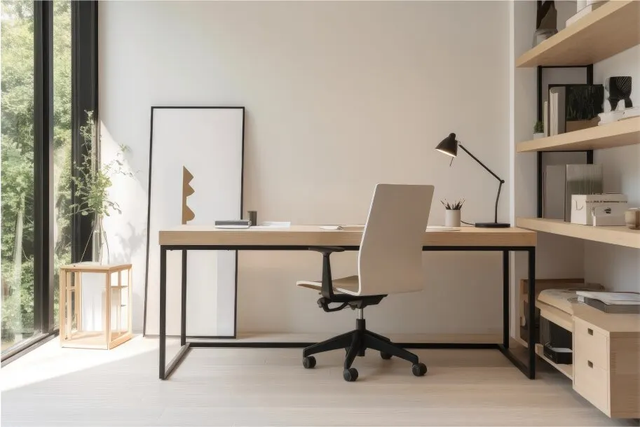 Modern desks come in a range of sizes and shapes so make sure you purchase one that can fit all the equipment you need on its surface. Other common features we recommend are desks designed with built-in cord management, desktop outlets for all your tech accessories, and extra storage, whether you choose a ladder desk with shelving or opt for one with more traditional drawers. All these features can help you maintain a focused, minimalist, and clutter-free space.