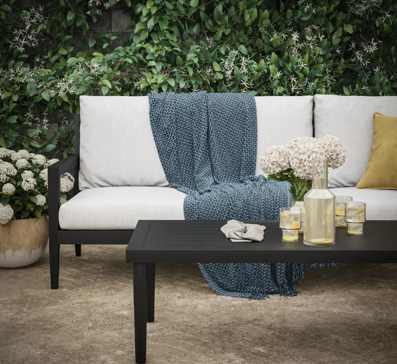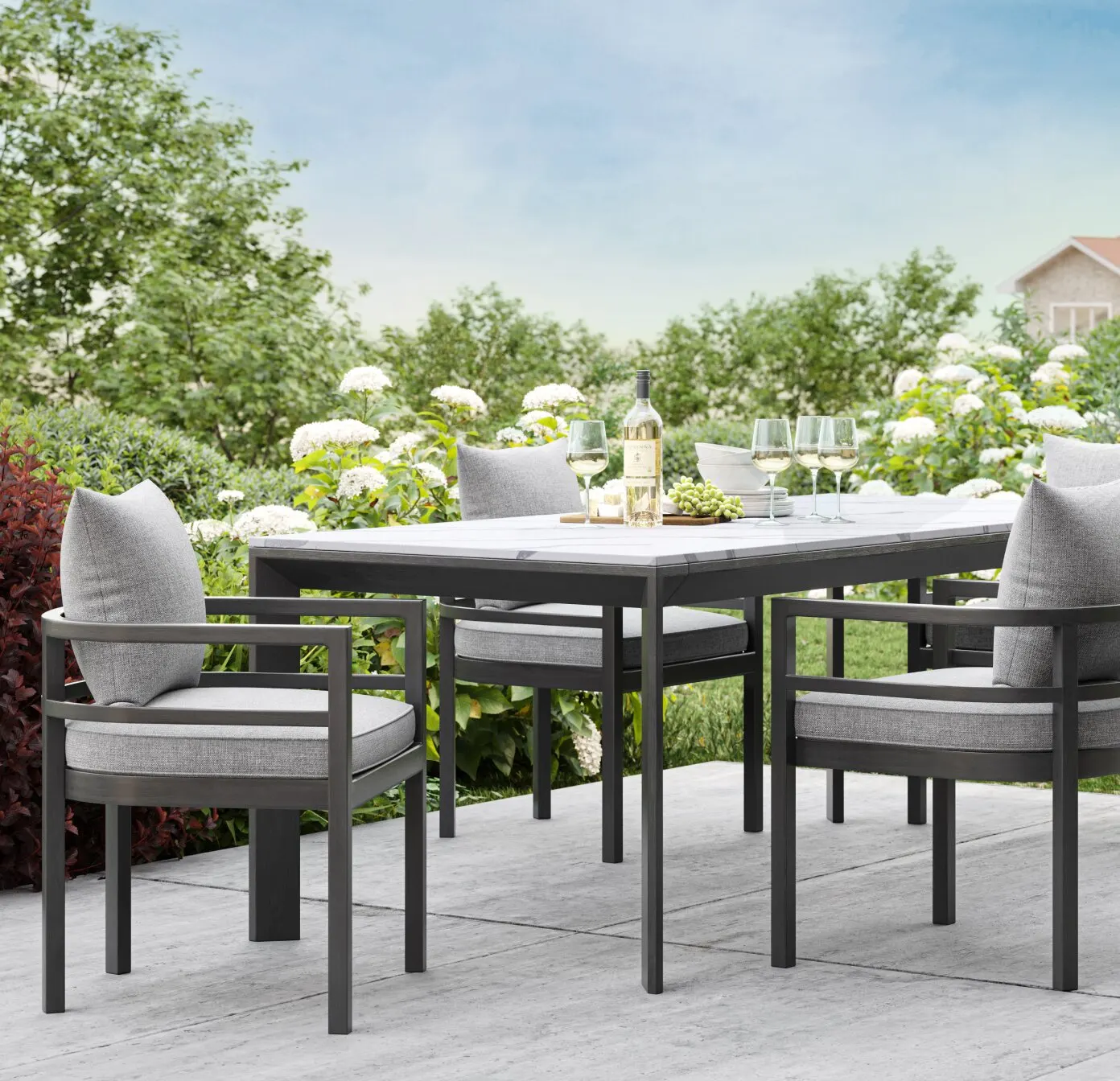 Curate a unique space for everyday enjoyment — the perfect setting for hosting a backyard soirée or enjoying quality time and fresh air. To set a magical mood, add ambient outdoor lighting, planters for more lush greenery, and textured and ornate designs made of metal that add a visual flair. As a final touch, add intimate coziness with outdoors rugs, pillows, and art.