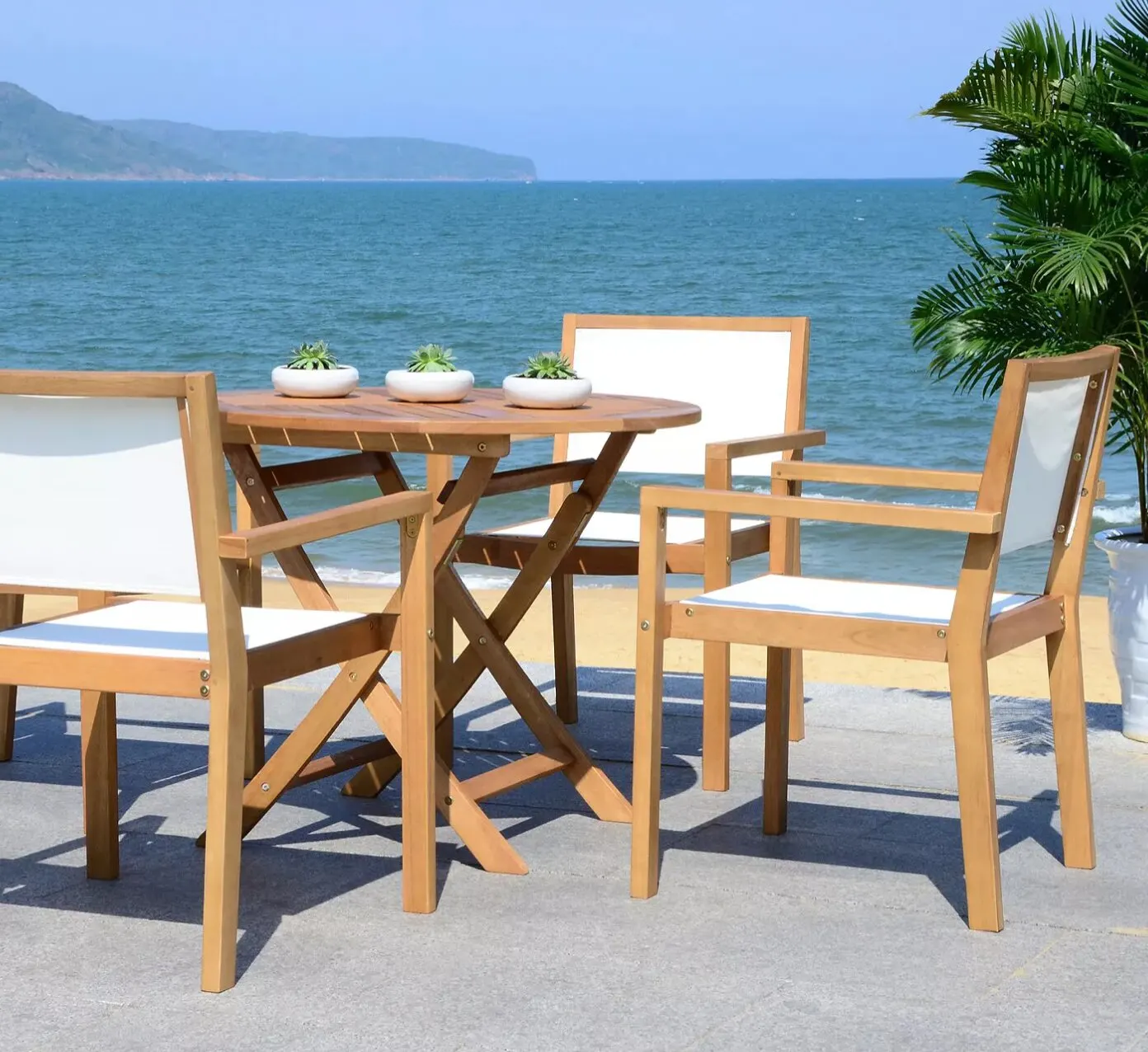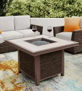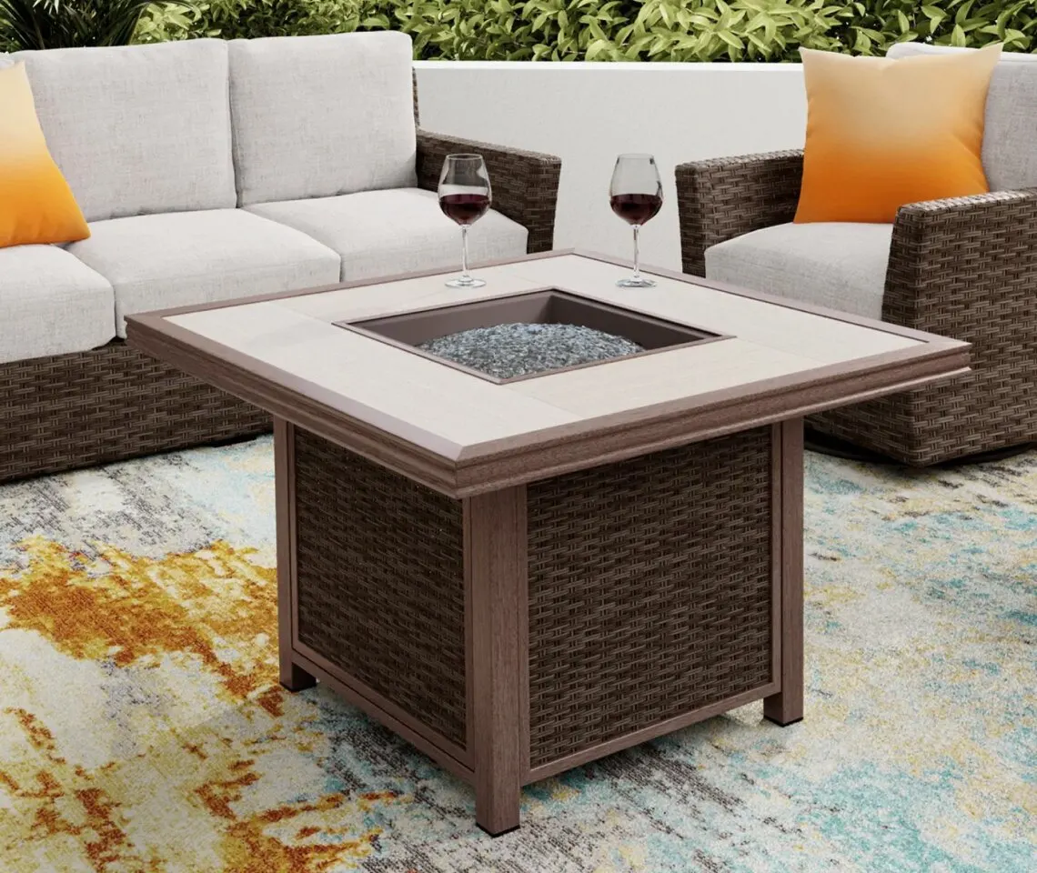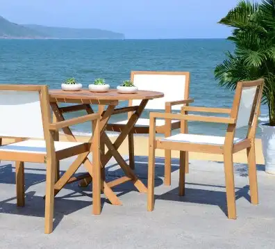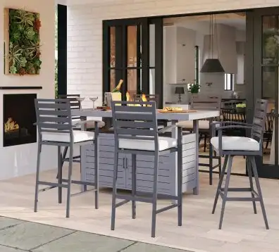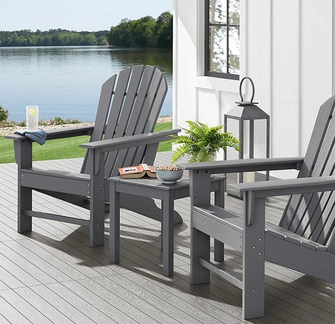 If you’re dreaming of cozy evenings around a crackling fire, bring your rustic vision to life with the lake house style. Choose durable furniture made of concrete, dark hardwoods like teak or eucalyptus, or even plastic — with Adirondack chairs being a particular hit. Complete the look with porch swings or hammocks, lanterns, and firepits or heaters.