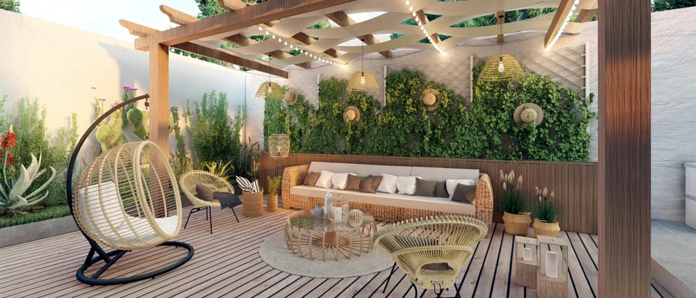 Most of the furniture here will be either wicker or rattan, and you should go for earthy tones that pair well with the wooden accents. Depending on how well-protected your pergola is, rugs and curtains may also be a choice.