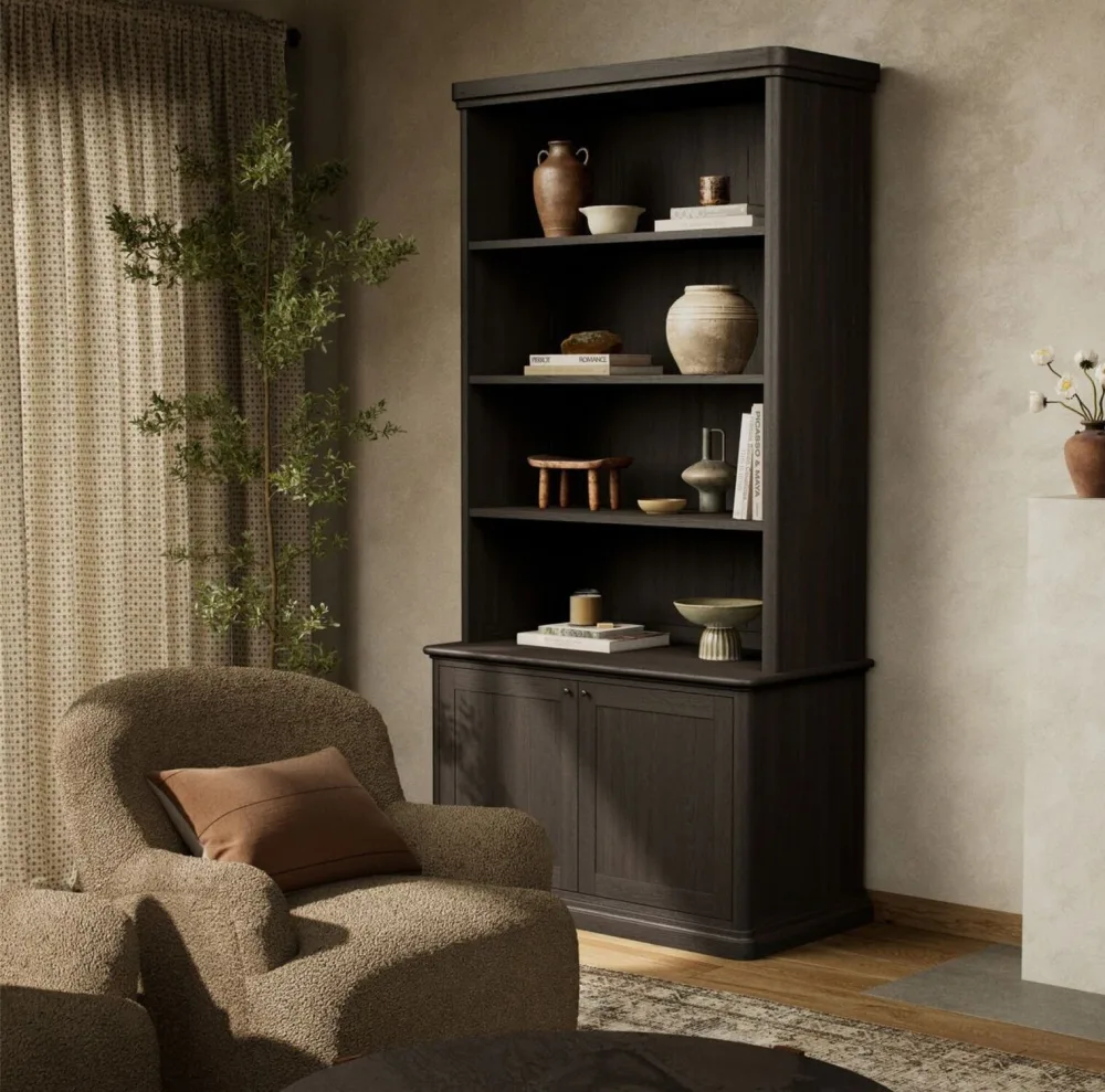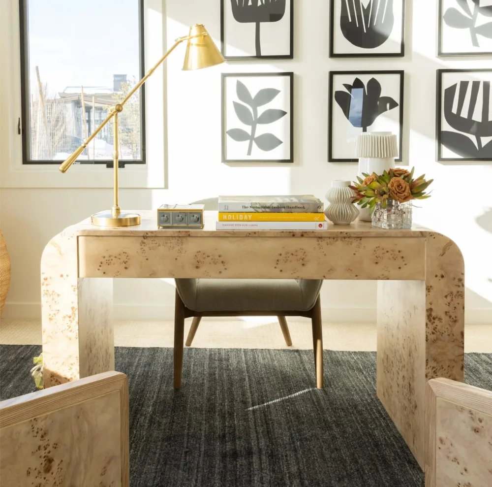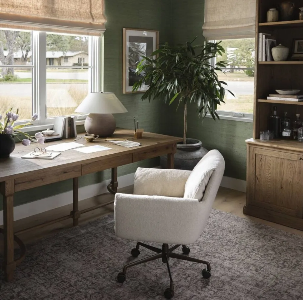 When it comes to chairs and other home office furniture, we like to prioritize comfort and support first — after all, you’ll be sitting here for hours and hours. Consider whether you would benefit from softer or firmer cushioning, breathable fabrics, or any extra features like casters or height-adjustability. In terms of style, unlike stereotypical office chairs, you have many options that can seamlessly blend into your home aesthetic, from a mid-century modern leather chair to a glam velvet one.