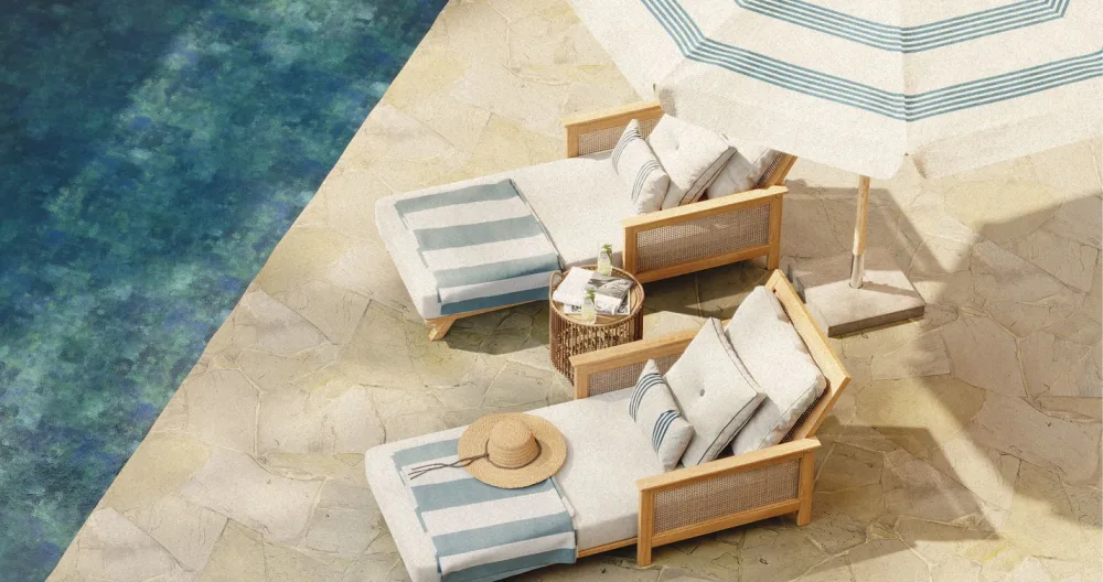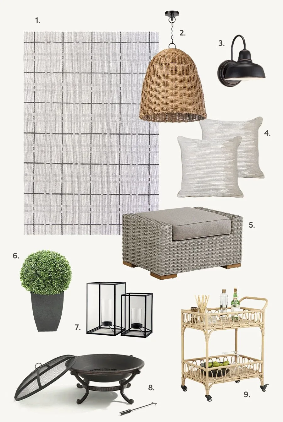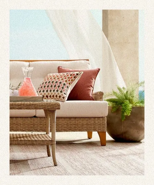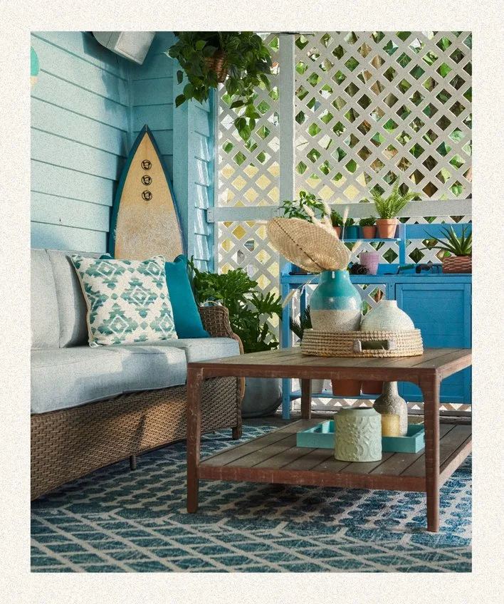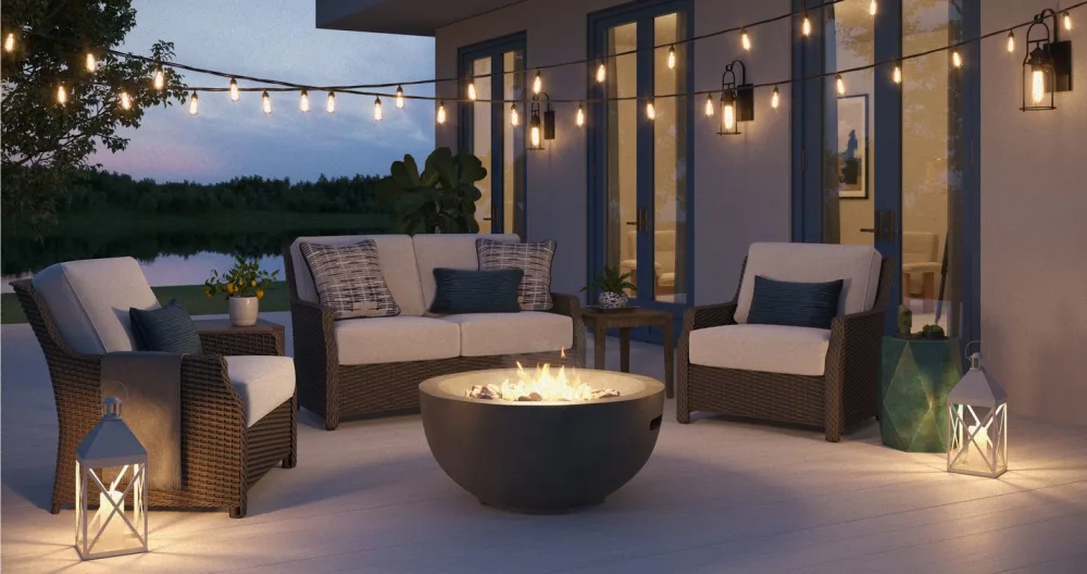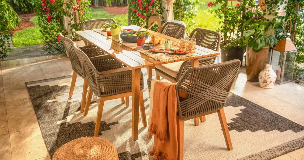 Textiles also add warmth. Layer outdoor rugs, throw blankets, and cushions in seating areas.