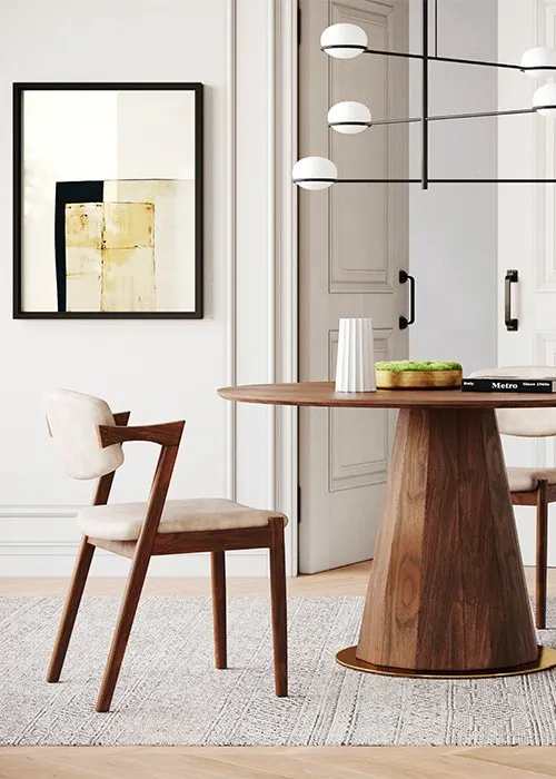 Classic shapes and clean lines are a hallmark of a transitional design. Balance out heavier pieces of furniture with simple yet sharp tables and accent pieces.
