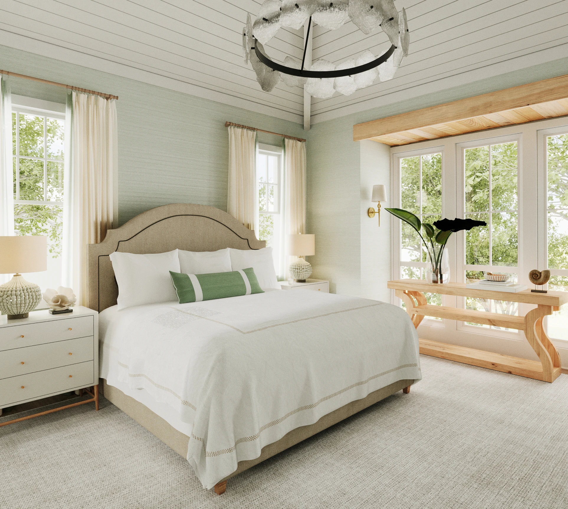 Create a seaside sanctuary by pairing organic materials like jute and wicker with classically upholstered pieces. Complete the look with gauzy white drapery or a bouquet of fresh hydrangeas.