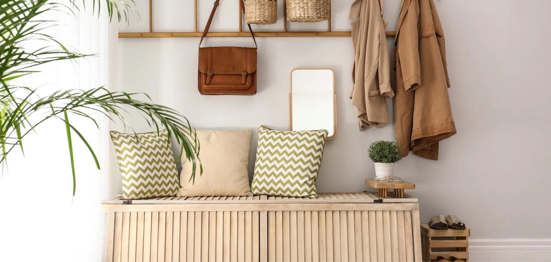 Or, add a cozy padded bench with storage drawers and install coat hooks above. Decorative features like an antique mirror or small floating shelf can bring the look together.