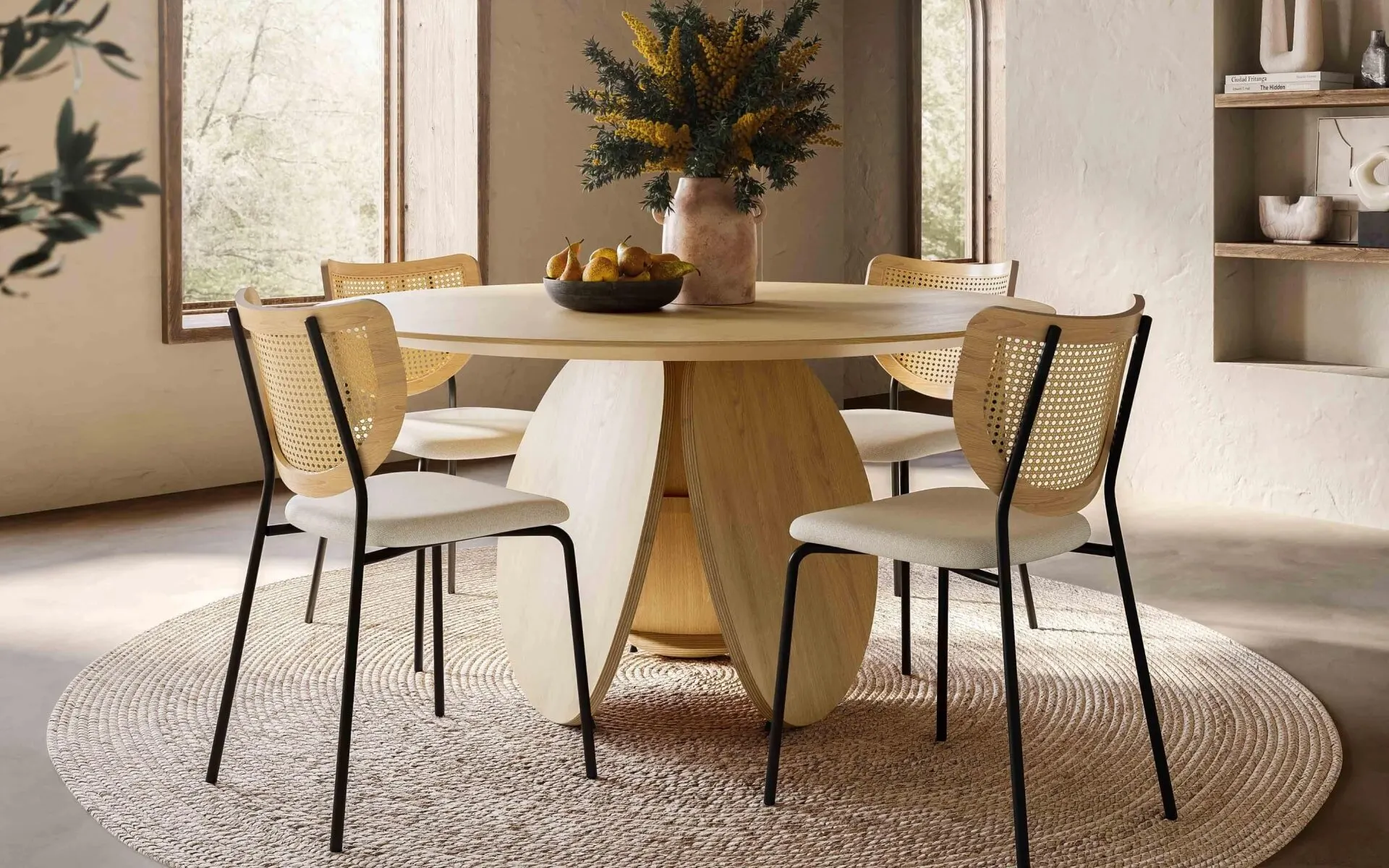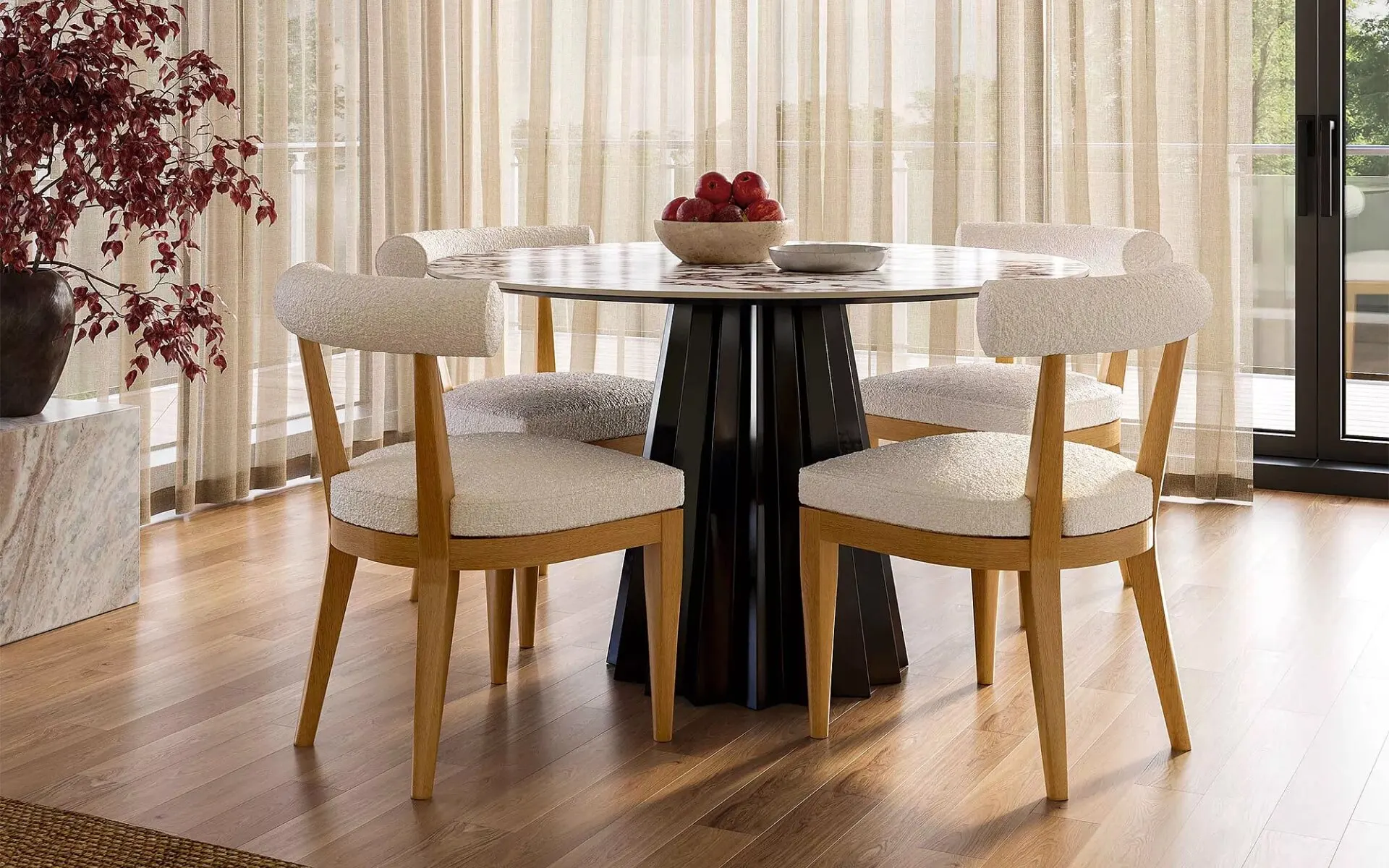 The biggest factor when deciding between a round or rectangular dining table is the shape and size of your space. Rectangular tables are longer and narrower, making them good for similarly shaped spaces. Round tables are better for a larger or square room where no part of the table will feel crowded against the walls. Though round tables often have fewer seats than rectangular ones, some come with inserts to accommodate more people. However, if you don’t often have enough people to fill a rectangular table, a round one feels less empty or lonely when eating solo or with only one or two companions.