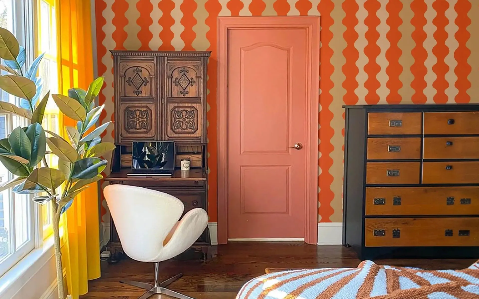 If you’d rather go with a more abstract design, another 2025 wallpaper trend is repeat patterns. This style resembles stenciling where one design is used over and over in a sequence for a classic look. It works well in bedrooms that need a little more visual interest, creativity, and whimsy without looking too loud or overwhelming.