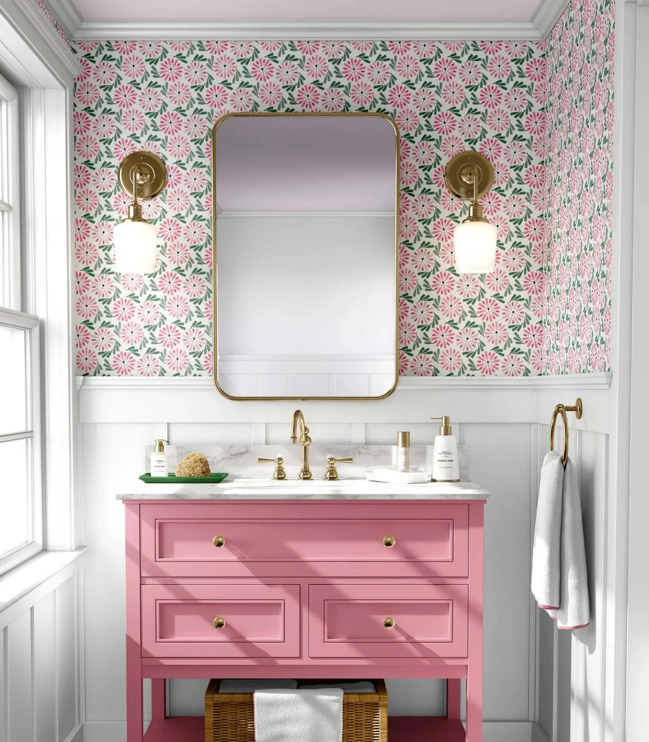 If the darker tones feel a bit too heavy for the bathroom and you want to stick with neutral colors, you can choose a mural that’s a soothing light blue color on a white background, or even something more retro and whimsical like pastel pink or butter yellow. There are endless ways to introduce the 2025 wallpaper trend into your bathroom in a way that feels true to your unique taste.