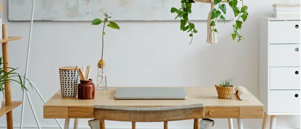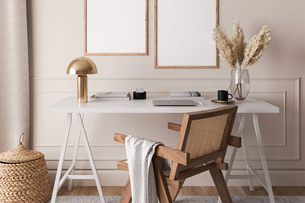 Bring a sense of calm and warmth to your workspace with coastal design or a Scandinavian-inspired setup. Pair your white desk with light wood accents, like a bamboo desk lamp or oak stationery holders. Then, layer in textures like a woven chair cushion to mimic natural elements. For colors, try neutral tones with subtle blue or green touches.