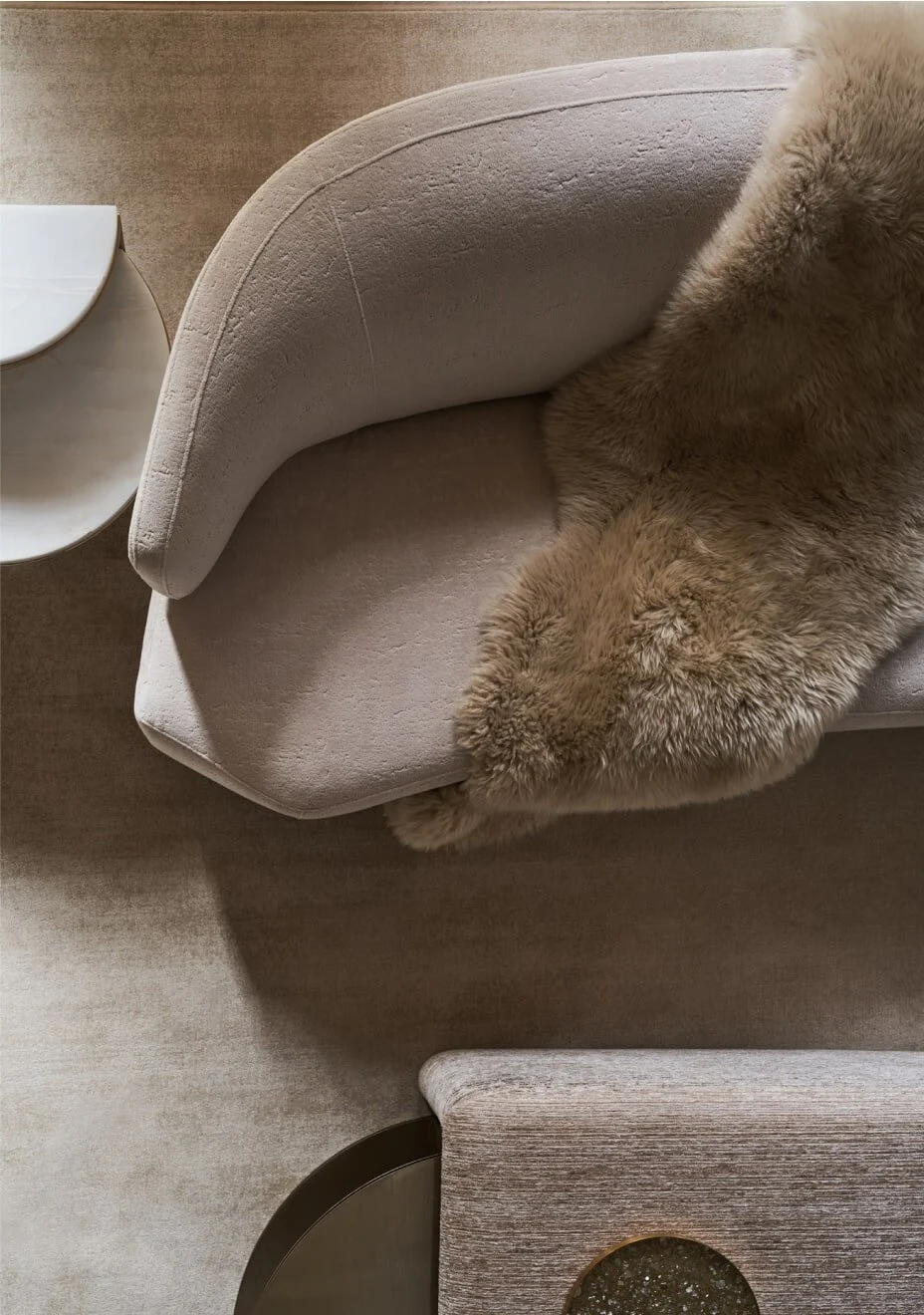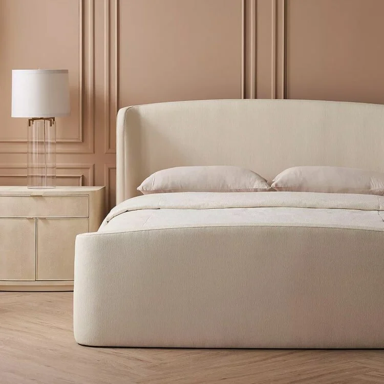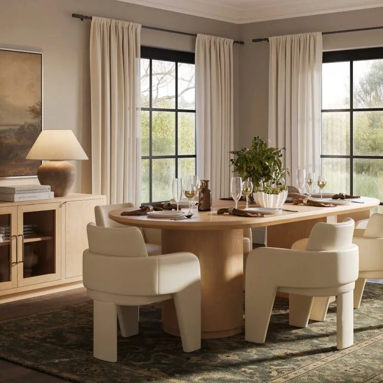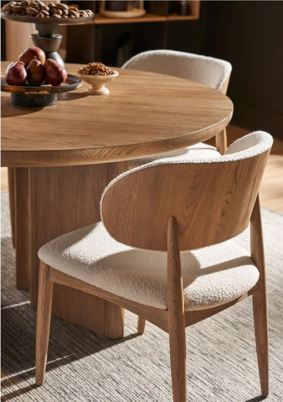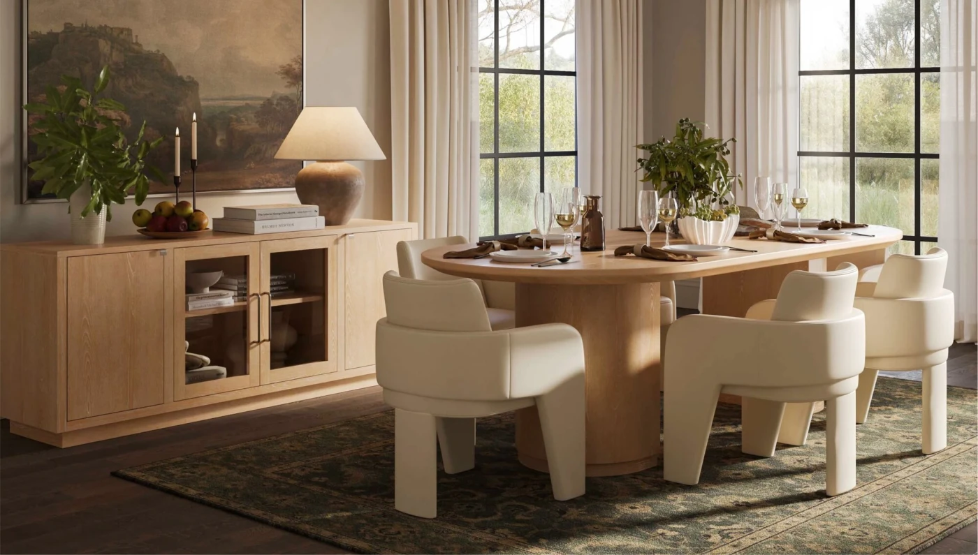 Let’s add a touch of organic beauty through curvy silhouettes. These flowy forms not only look comfortable, soothing, and inviting, but they can also be designed to envelop your body. Consider barrel-backed dining chairs and reading chairs to cocoon you in coziness or a curvy sofa that feels like you’re sitting on a cloud. To elevate it even further, choose soft and plush upholstery, from regal velvet to fleecy boucle.