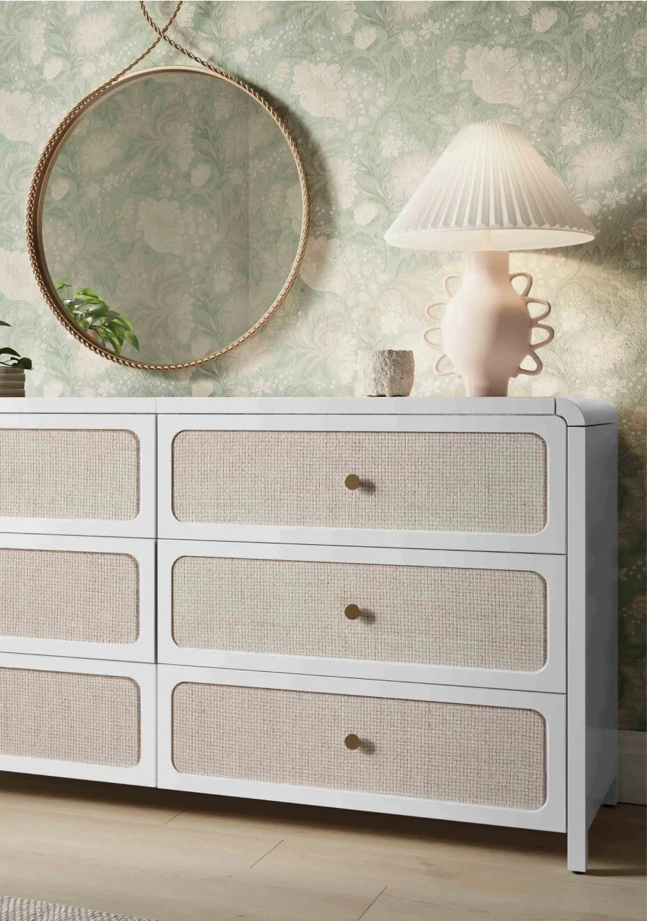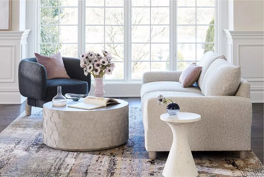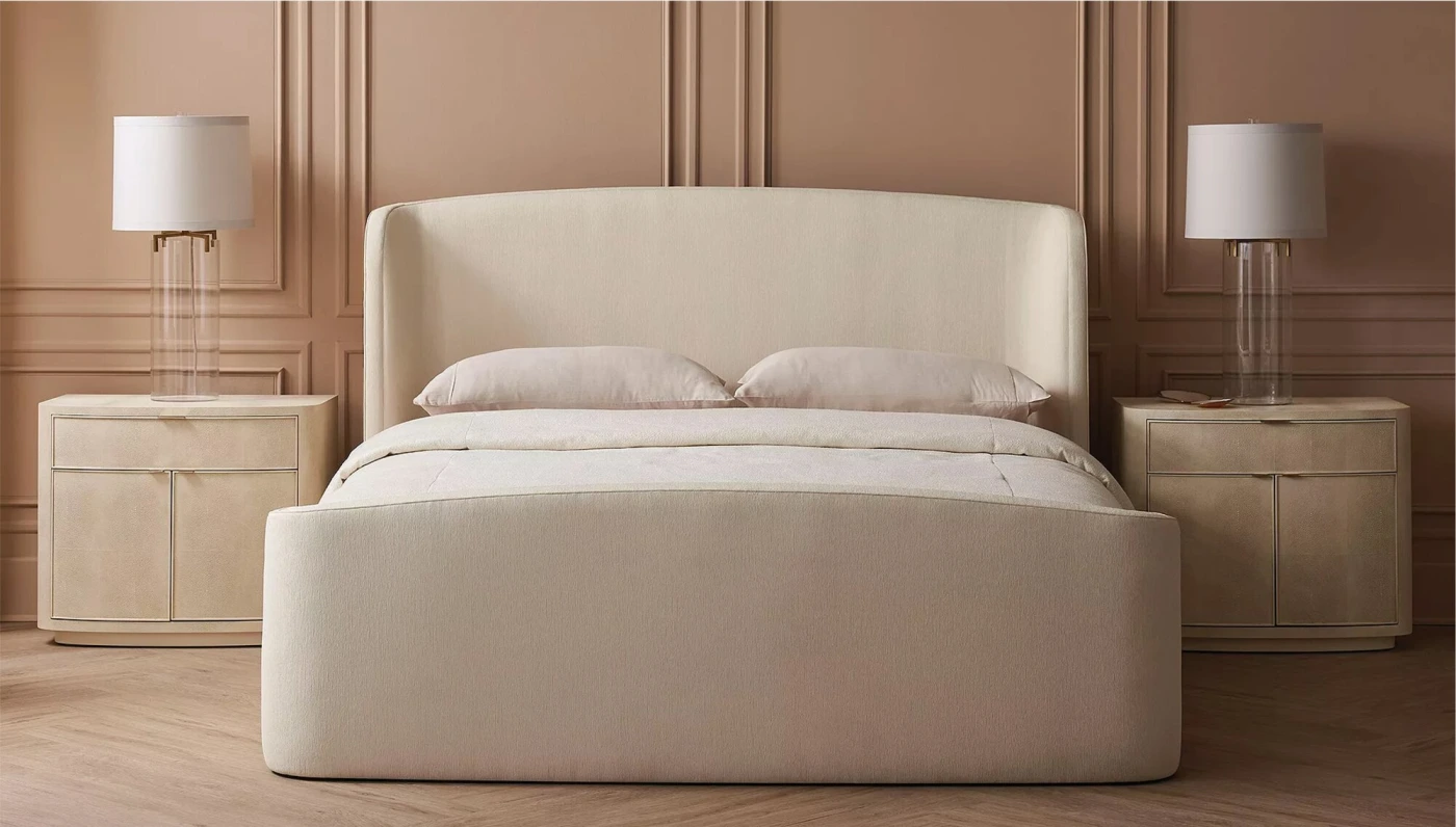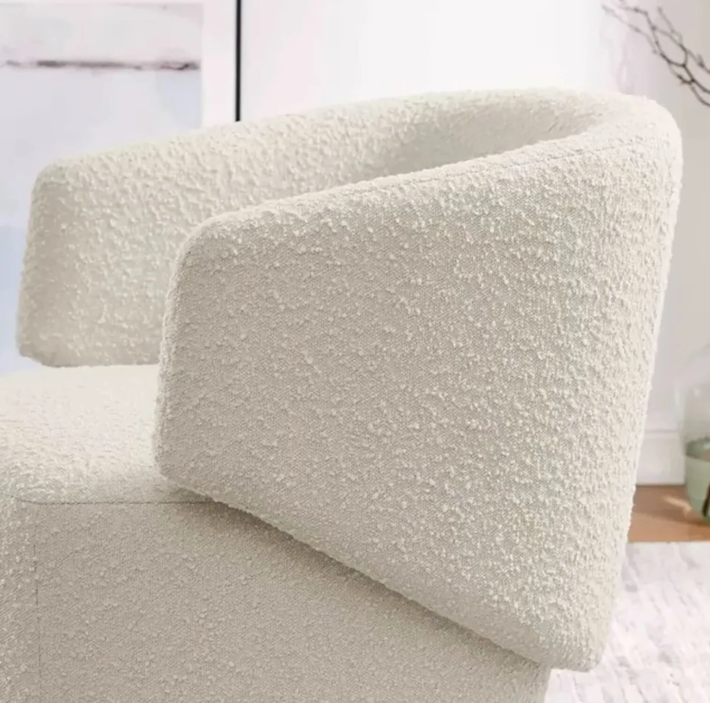 Let’s add a touch of organic beauty through curvy silhouettes. These flowy forms not only look comfortable, soothing, and inviting, but they can also be designed to envelop your body. Consider barrel-backed dining chairs and reading chairs to cocoon you in coziness or a curvy sofa that feels like you’re sitting on a cloud. To elevate it even further, choose soft and plush upholstery, from regal velvet to fleecy boucle.