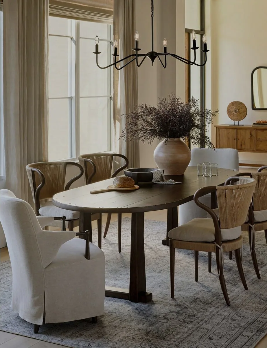 The farmhouse dining table is the star here. For an authentic look, choose one made from your favorite type of wood with a raw edge. Pair it with cross-back chairs or benches for a casual, inviting vibe. A solid wood sideboard or buffet is a great way to add storage and extra surface space for decor.