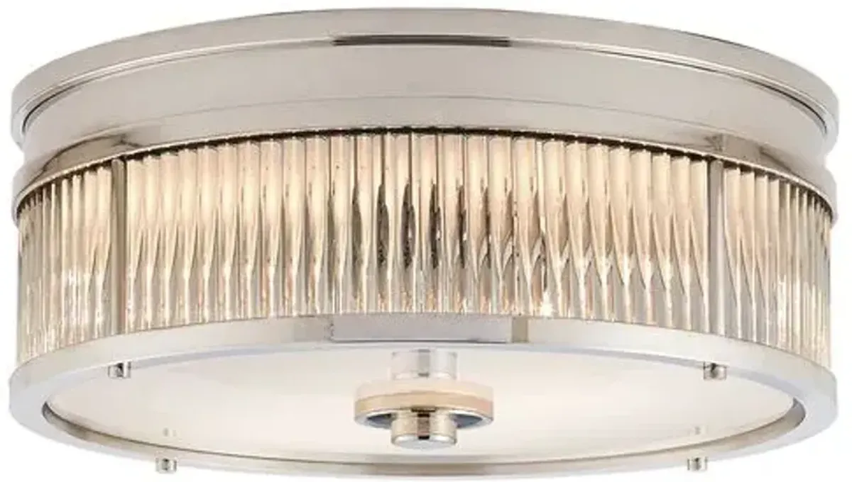 Product Overview Allen Medium Round Flush Mount in Polished Nickel and Glass Rods with White Glass Specifications & Warranty Brand • Brand Name: Visual Comfort Collection • Collection Name: Ralph Lauren Dimensions (inches/lbs) • Height (bottom to top): 12.25 • Width (side to side): 12.25 Features • Assembly: Customer Assembly Required • Hardware: Height: 7.5"; Width: 12.25"; Socket: 3 - E26 Keyless; Wattage: 3 - 40 A19 Style • Style: Modern Vendor Features • Additional: Height: 7.5"; Width: 12.25"; Socket: 3 - E26 Keyless; Wattage: 3 - 40 A19