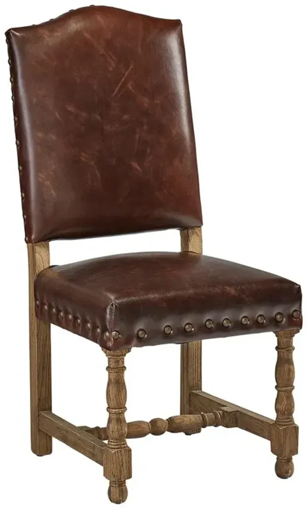 Hadassah French Brown Leather Upholstered Oak Wood Nailhead Dining Side Chair