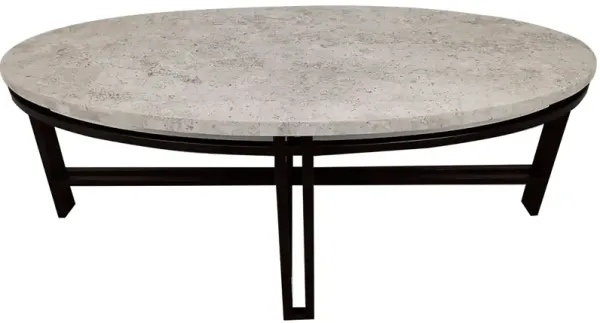 Vivian Industrial Beige Travertine Stone Top Bronze Steel Oval Coffee Table