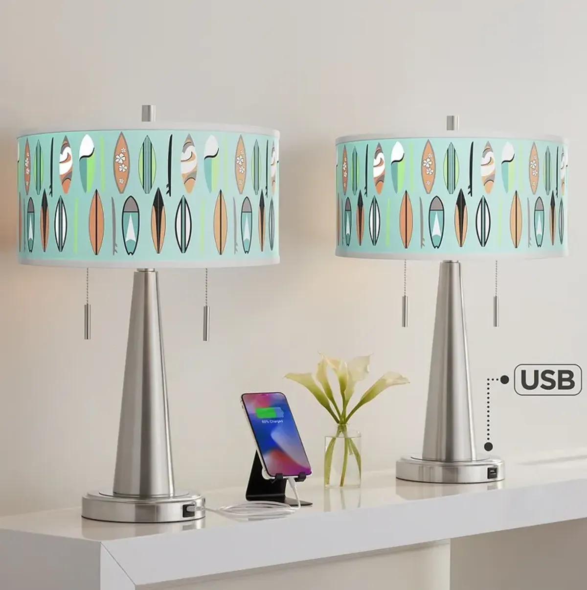 Retro Surf Vicki Brushed Nickel USB Table Lamps Set of 2